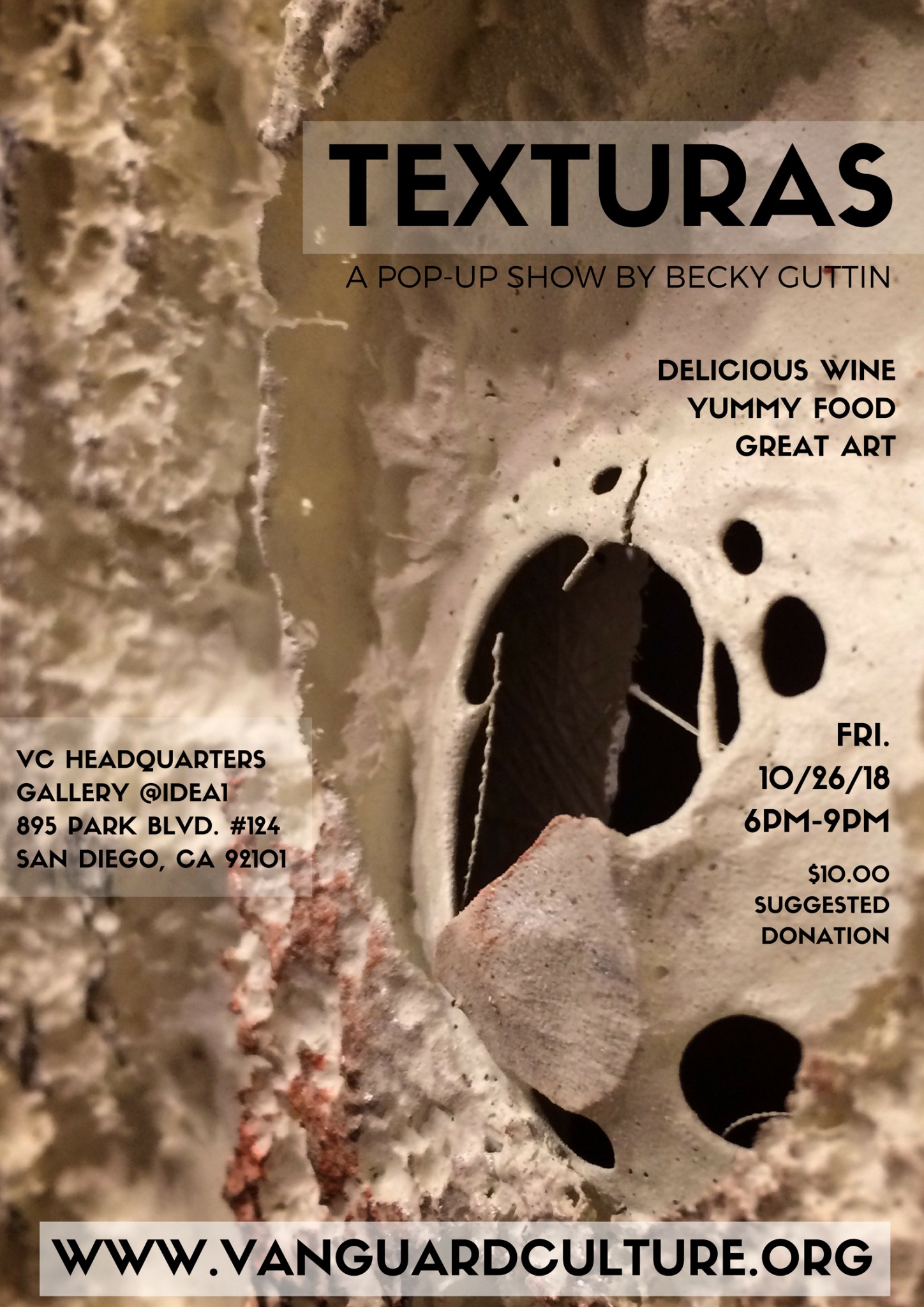In signature Vanguard Culture style, the opening of TEXTURAS by Becky Guttin will include delicious wines from the Valle de Guadalupe presented by Baja Wine + Food. You will also enjoy delicious bites by our Culinary Director, Chef Daniella de la Puente of La Cocina Secreta.