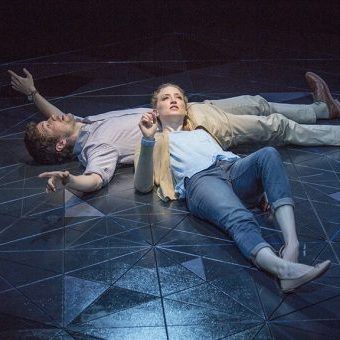 David Israel Reynoso’s set design, simple and fitting like a constellation on the floor where the actors lay and sit down and walk. This is a perfect design for both the Sheryl and Harvey White Theatre and this type of piece, being that they present the more ‘experimental’ contents in this space. Victoria and Christian show great rapport and went along with this whole vibe of just having two actors onstage with no change of costume, or scenery. It is a tough job to deliver. Two average people on an average weekend (it was a weekend in my head) ‘illustrated’ by Elisa Benzoni’s Costume Design.