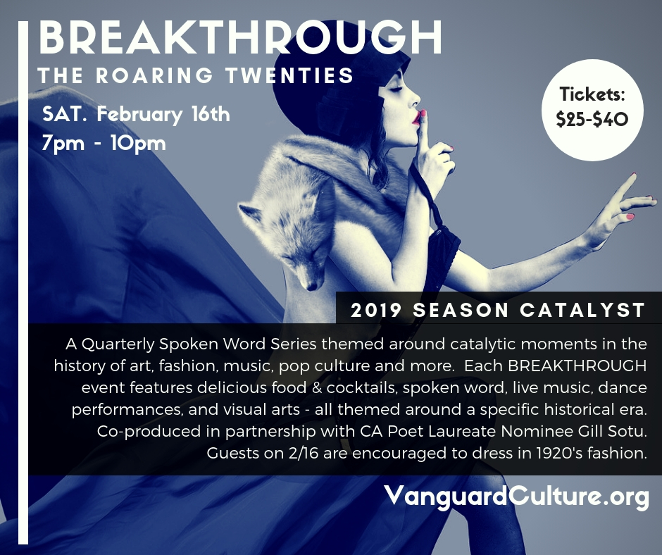 BREAKTHROUGH is a quarterly Spoken Word Series themed around catalytic moments in the history of art, science, fashion, music, pop culture and more. Each event includes delicious food, live music, spoken word, dance performances, and visual arts – all themed around a specific historical era. Co-produced in partnership with CA Poet Laureate Nominee Gill Sotu. Guests are encouraged to dress in costume of the era. This episode was themed around The Roaring Twenties.