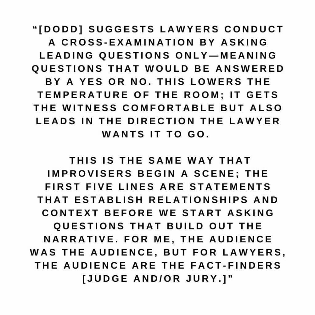 “As I listened to [Dodd] explain his tenets of cross-examination, I thought, “why do these feel familiar?” Then it clicked; he was teaching the rules of improv!”