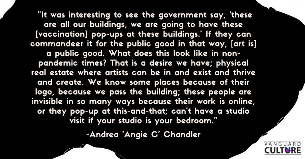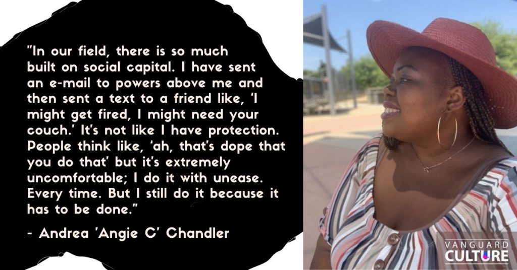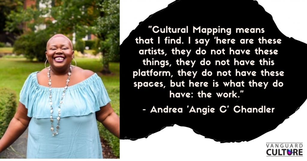 Andrea ‘Angie C’ Chandler is a fire-starter; a self-lit woman committed to illuminating historically excluded art and artists. Like a campfire, Chandler’s energy both draws people together and drives away the darkness. Based on her arts resume in San Diego, it scarcely seems possible that she only arrived in the city in January 2020.