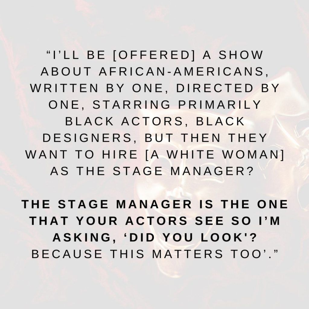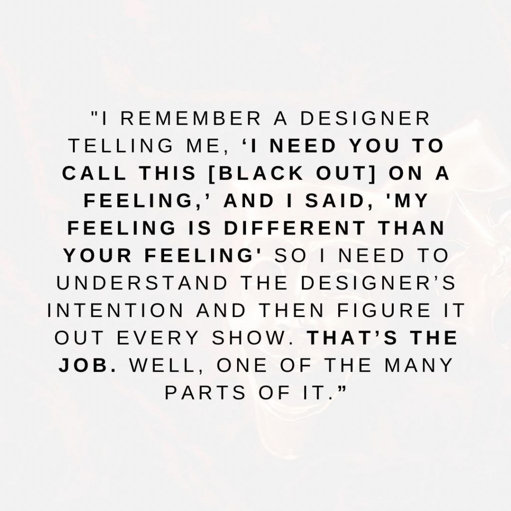 I did not understand the concept of maintaining a show, so she explained: “Once a show opens, the director leaves. My job is maintaining the artistic integrity of the director’s vision all the way through for the closing night audiences. That is why [as a Stage Manager] even when the director doesn’t think you’re listening, you need to be listening; that’s why the stage manager always has to be present. Even for designer meetings. In the rehearsal room, I’ll write down certain phrases the director says while coaching an actor. If an actor starts making their own choices two weeks after opening, like adding pauses or speeding it up, I gotta clock that. When I do, I use the director’s own words to get the show back on track. There’s an art to that.”
