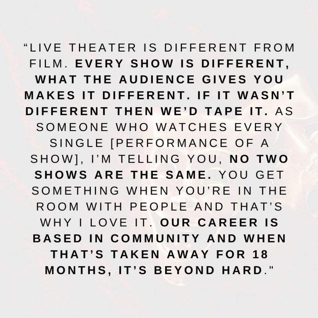 At the same time, Brose’s dedication for theater is apparent; especially when she spoke to the pandemic shut-down being the longest stretch of her adult life without a show and the extraordinarily painful void found in waiting for live theatre to return.