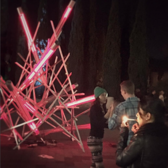 Art Lab also has four other site-specific projects ranging from a collaborative exploration of migration and movement with Hugo Crosthwaite (visual art), Marilu Salinas (violin) and Theresa Magaro (Butoh dance) to a light installation by Adrian Sierra Garcia to a booth of work by San Diego Art Prize winners from the San Diego Art Institute. The booth, curated by budding curators from Alessandra Moctezuma’s Museum Studies Program at Mesa College, features work by up and coming local artists such as Margaret Noble, Bhavna Mehta and Anna Stump. One section of the booth is devoted to the 2016 San Diego Art Prize winners William Feeney and Shinpei Takeda who recently collaborated with the AjA Project and The New Americans Museum (“Inscription”).