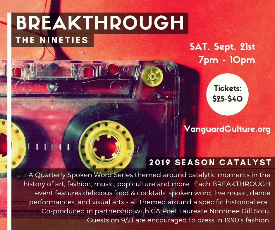 This quarterly Spoken Word Series is themed around catalytic moments in the history of art, fashion, science, music, pop culture and more. Each event includes delicious food, live music, spoken word, dance, and visual arts – all themed around a specific historical era. Co-produced in partnership with CA Poet Laureate Nominee Gill Sotu, guests will be encouraged to dress in costume of each era. This episode was themed around The Nineties. Costumes encouraged.