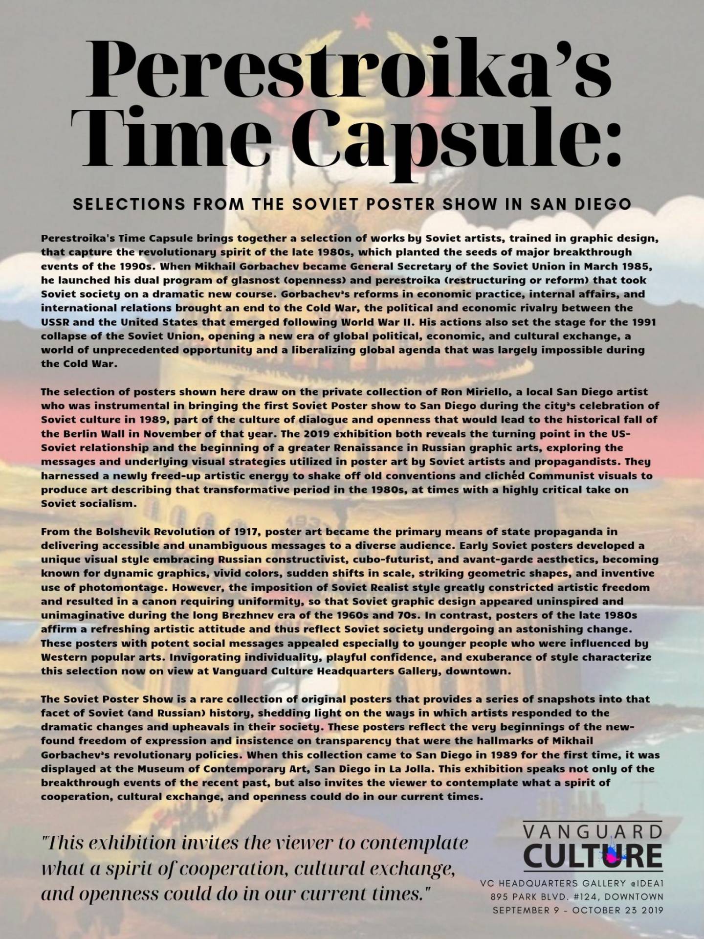 An exhibit featuring a rare collection of Glasnost and Perestroika posters from the period of Gorbachev by collector Ron Mirello. The Soviet Poster Show collection was created in 1988 for the San Diego Soviet Arts Festival.This exhibition isa nod to the end of the Cold War… and its tremendous effect on Nineties culture. CLICK HERE to learn more.