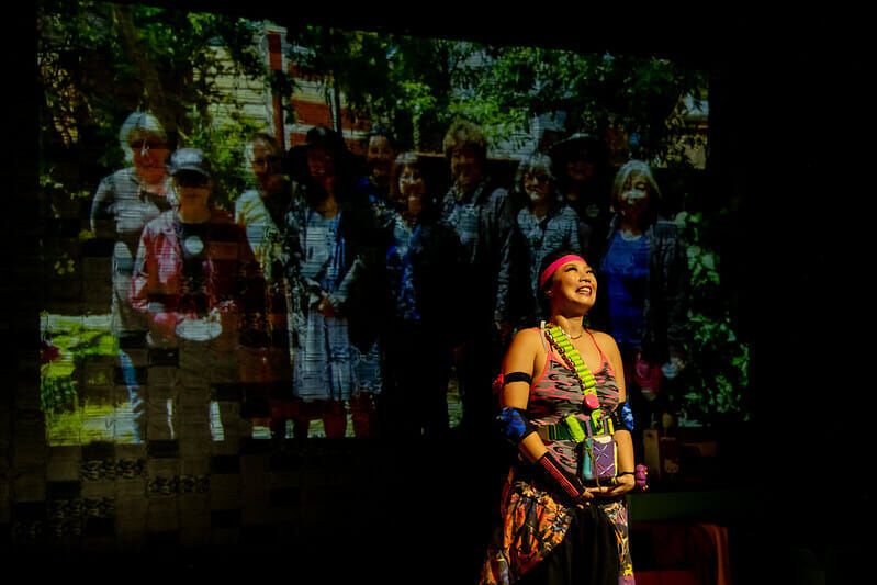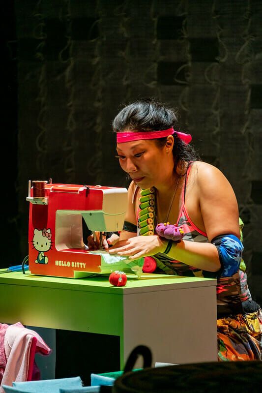 She mixes potty humor with potent heroism; Wong named the sewing group Auntie Sewing Squad (A.S.S.). While her team aided health care workers, farm workers, and incarcerated people, it is hardly self-aggrandizing. Wong cracks child labor jokes when describing the kids who contributed to A.S.S.’s total donation of 350,000 masks. There is a point in the show when the audience is invited to throw their bras onto the stage (and a few people did on opening night) when reminding us of the elastic shortages which prompted Americans to cut up undergarments and bed sheets when hospitals called for help sourcing personal protective equipment. The recent news images (projected on a screen made of masks) are cathartic or triggering; it is hard to tell when you are snickering at the same time.