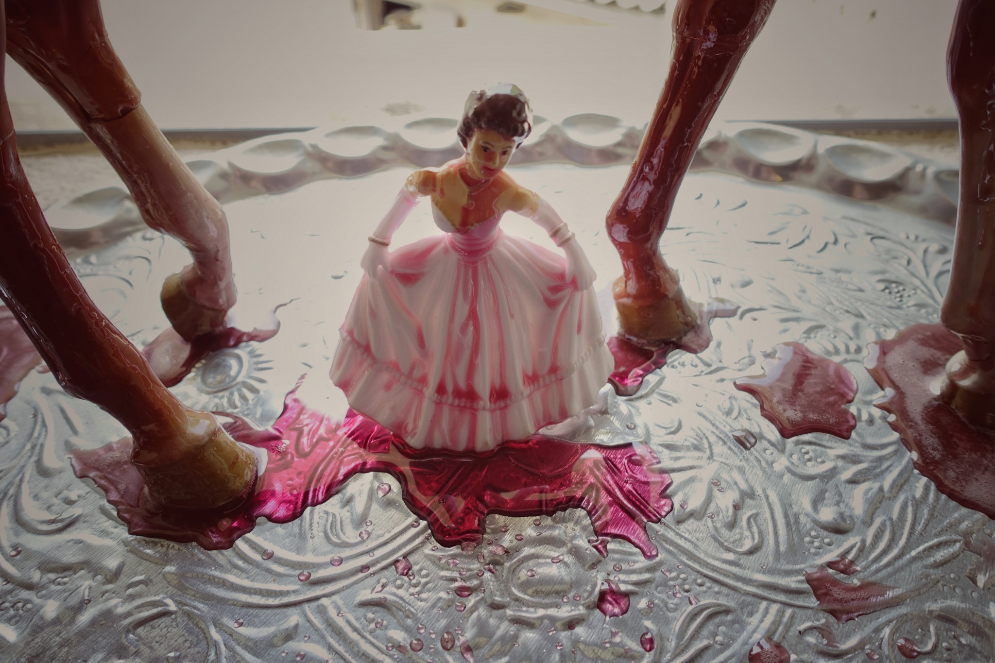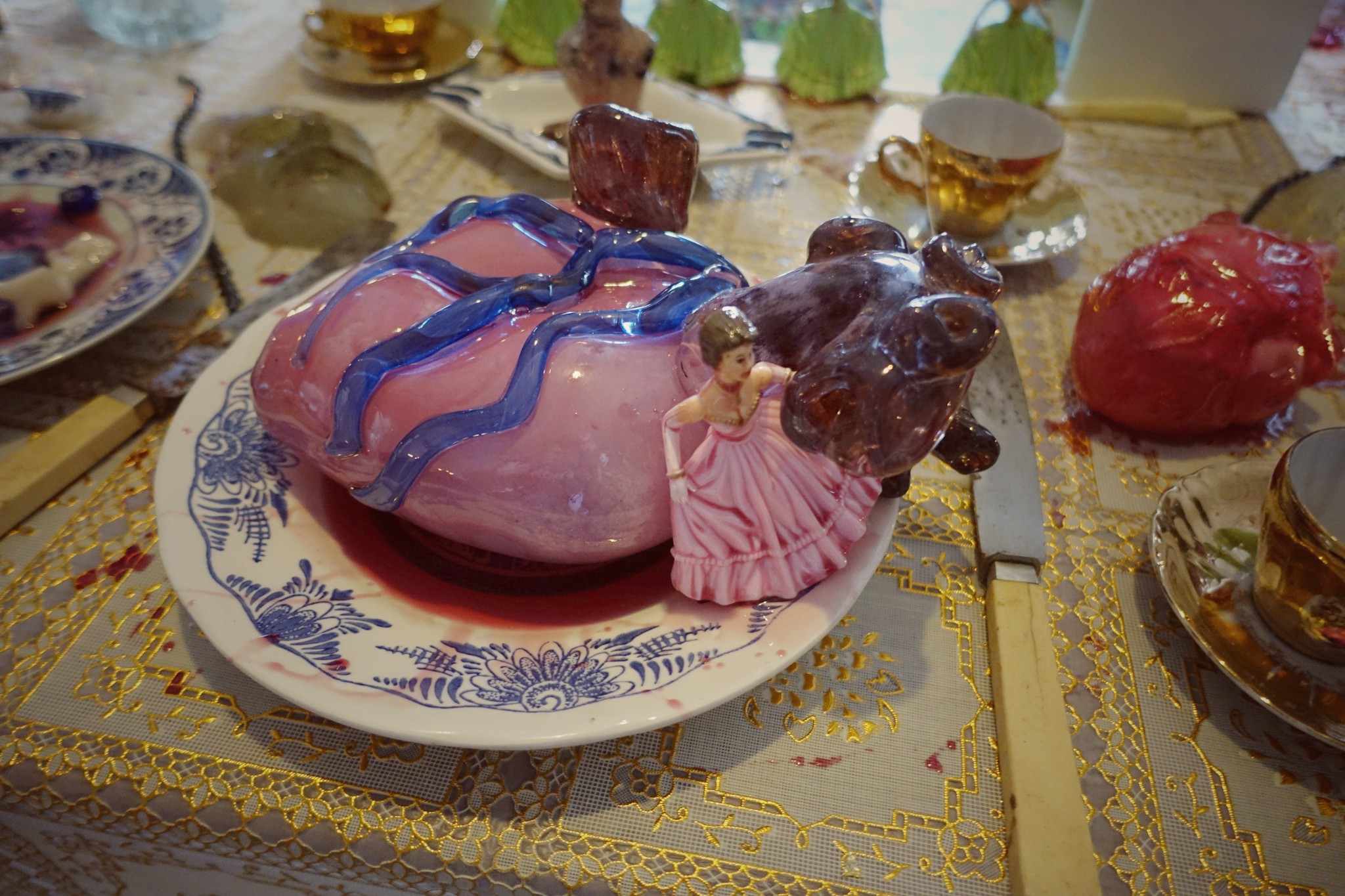 12:33 pm: T minus four hours and 27 minutes until the opening. “Oh, that’s why Jamex wanted the hacksaw,”I think as I walk in to see the crucifix that had made a short appearance as a hood ornament and was now coming cockeyed out of the horse’s back, flanked by Einar’s quinceañeras. While looking around the table, I notice the combinations taking place, each plate arranged with its own mélange of objects, and an eyeball floating in goo in several teacups. As the brothers work, every inch of the table comes alive with some bit of color or oddity. “I’m balancing everything out; we want every area to have content, no area to be boring…” muses Einar as he nestles another quinceañera up to a large glass heart in a pool of red goo on a plate. As he is fond of saying: they are not Minimalists; they are MAXimalists!