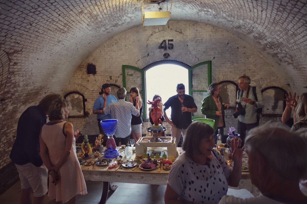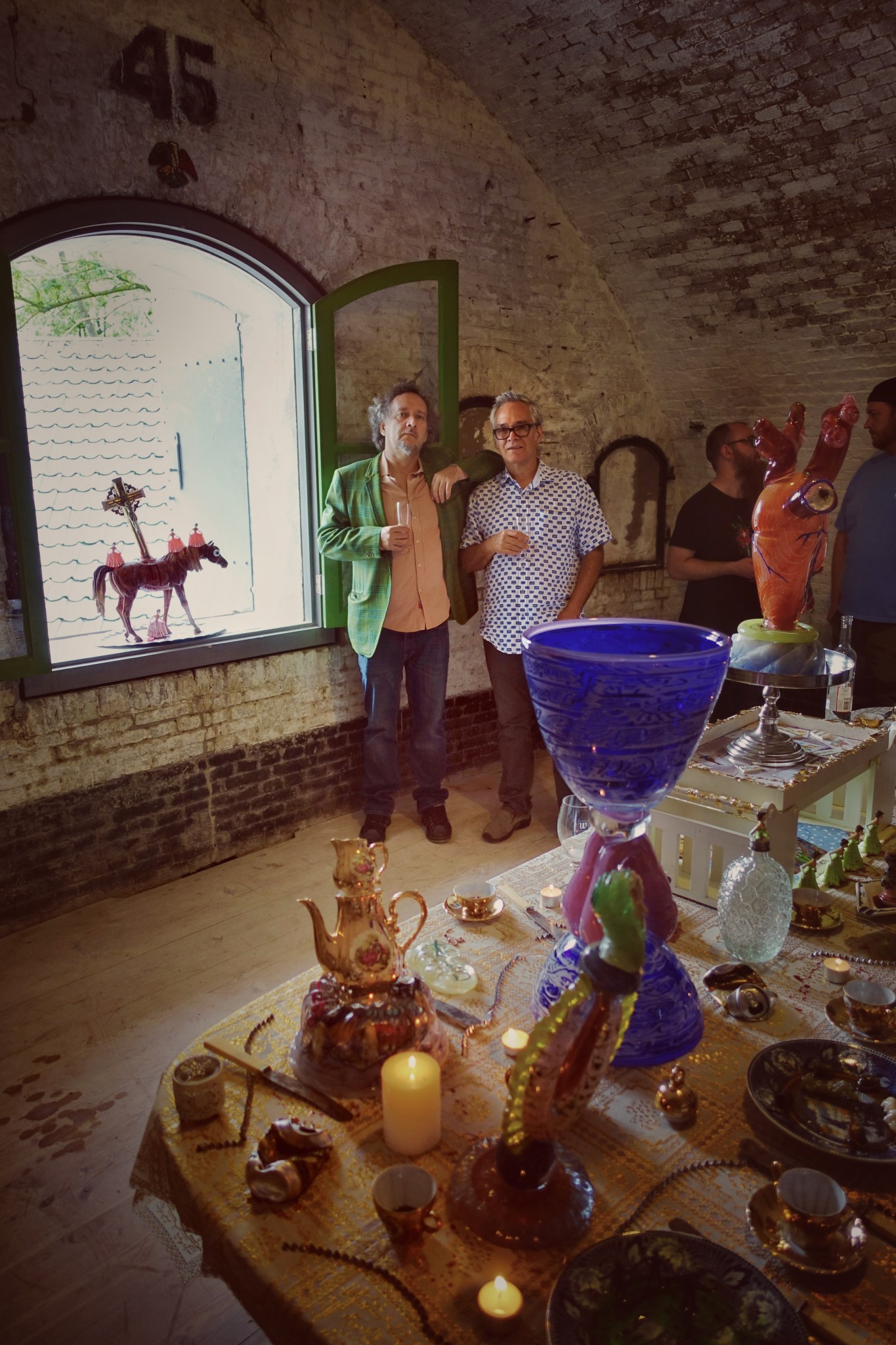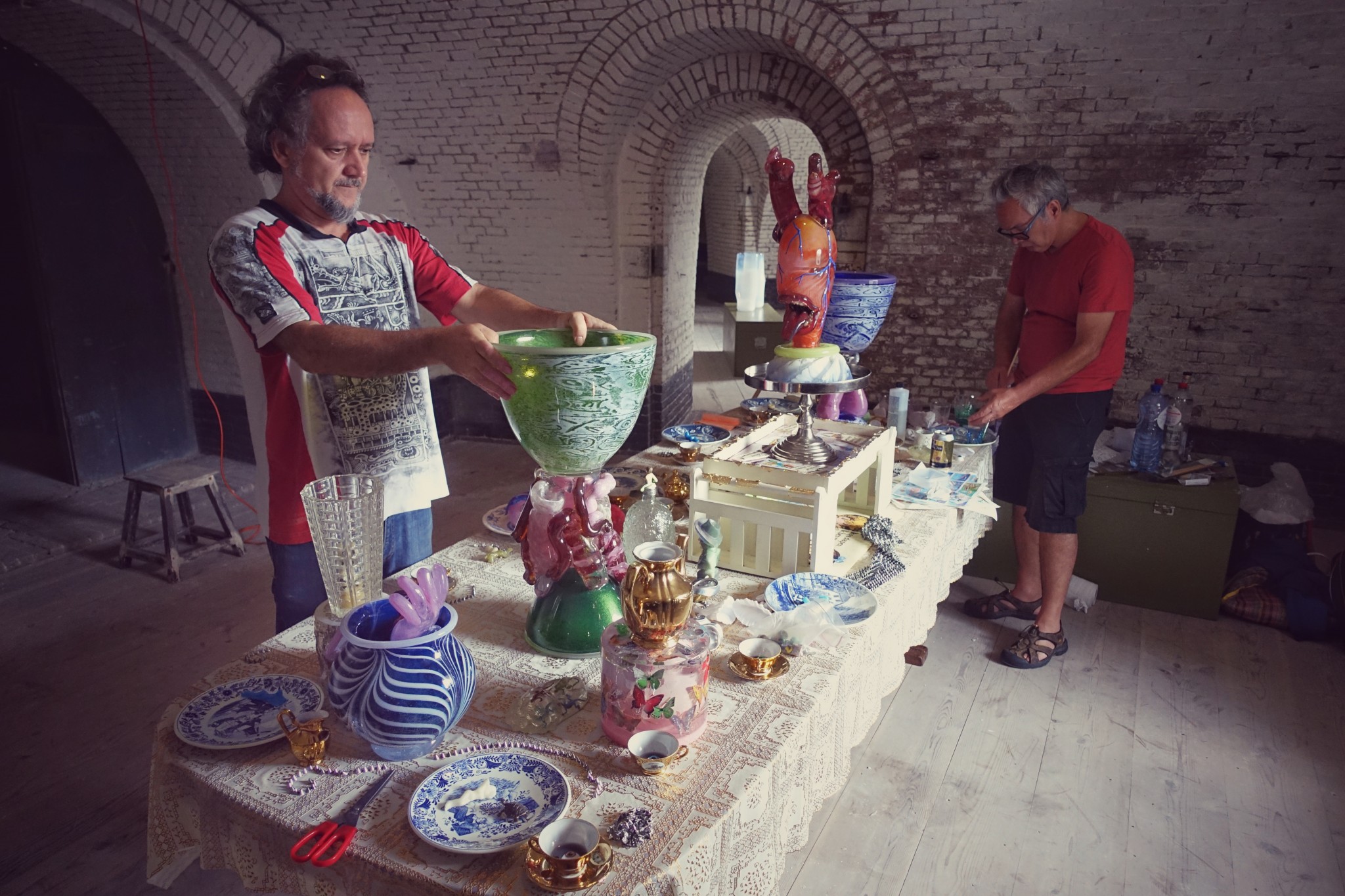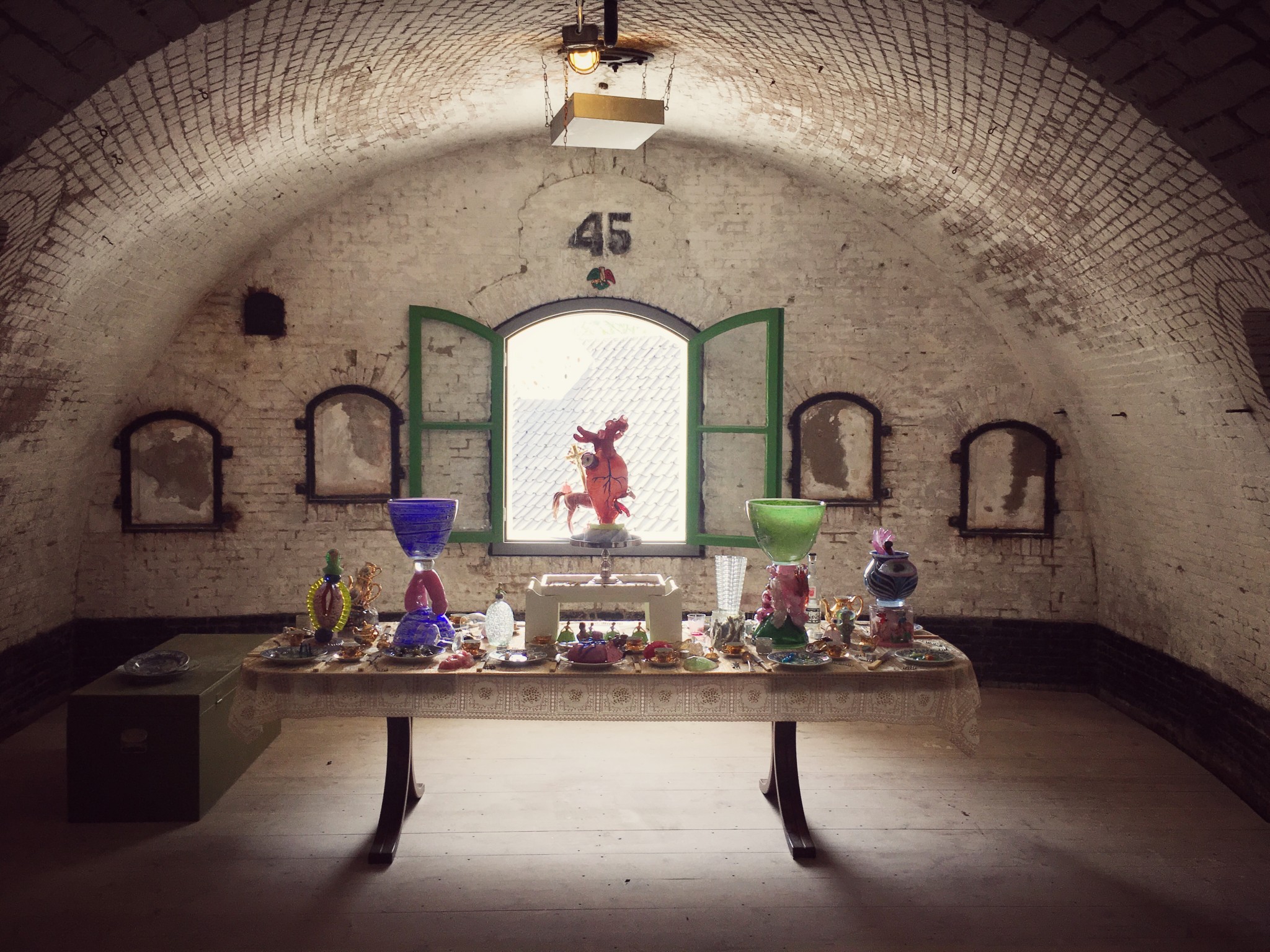 The next morning, Einar and Jamex discussed over breakfast what they would do that day—the opening was at 5:00 pm the following day and the work wasn’t even at the fort yet. At that point, they had only seen pictures of the two rooms they would transform in their Fantastical-Baroque-de la Torre style. As the brothers rode their bikes through the quaint Dutch town, cobblestones gave way to paved dikes with occasional bridges over the locks that control the flow of water throughout the countryside. Crossing yet another bridge and parking their bikes next to the Kunst Fort, the brothers discovered that the fort wasn’t open yet. A few master glass blowers who were old friends of theirs heartily welcomed them as they waited out front drinking coffee from the little cottage cafe next to the fort.