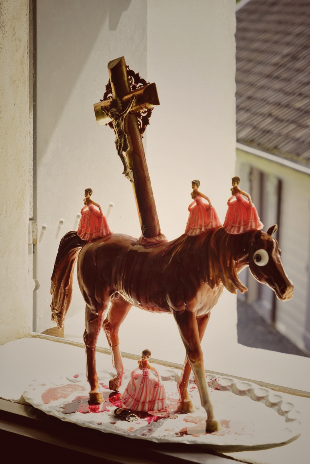 After sawing the horse off the plastic base and handing it over to Jamex, I hurry off to find an extension cord for the glue gun. Stressing over time, I run up the stairs and bound into the room to see Jamex contemplatively balancing a bust of Julius Caesar on the horse’s back while Einar arranges the mess of objects on the table. The opening is in less than eight hours and they don’t seem concerned in the least?