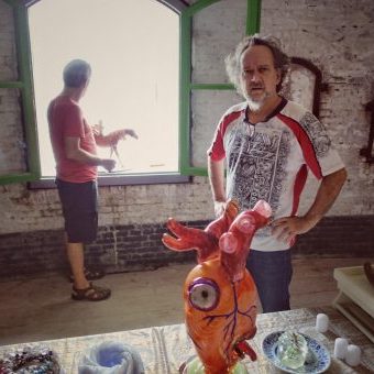 I looked at the HUGE suitcase I agreed to bring to the de la Torre Brothers for their upcoming installation at the Glass Cities art exhibition in Leerdam, Holland. Einar & Jamex had crammed it with toys, metal trinkets, plastic beads, bottles of toxic resin, spray-paint pens, and a plastic gold-doily tablecloth that they’d bought in a fabric shop in Ensenada, Mexico, where they live most of the year. The suitcase weighed just under 50 pounds, the airport check-in limit. Fifty pounds of baubles! The airport security x-ray images were sure to be epic!
