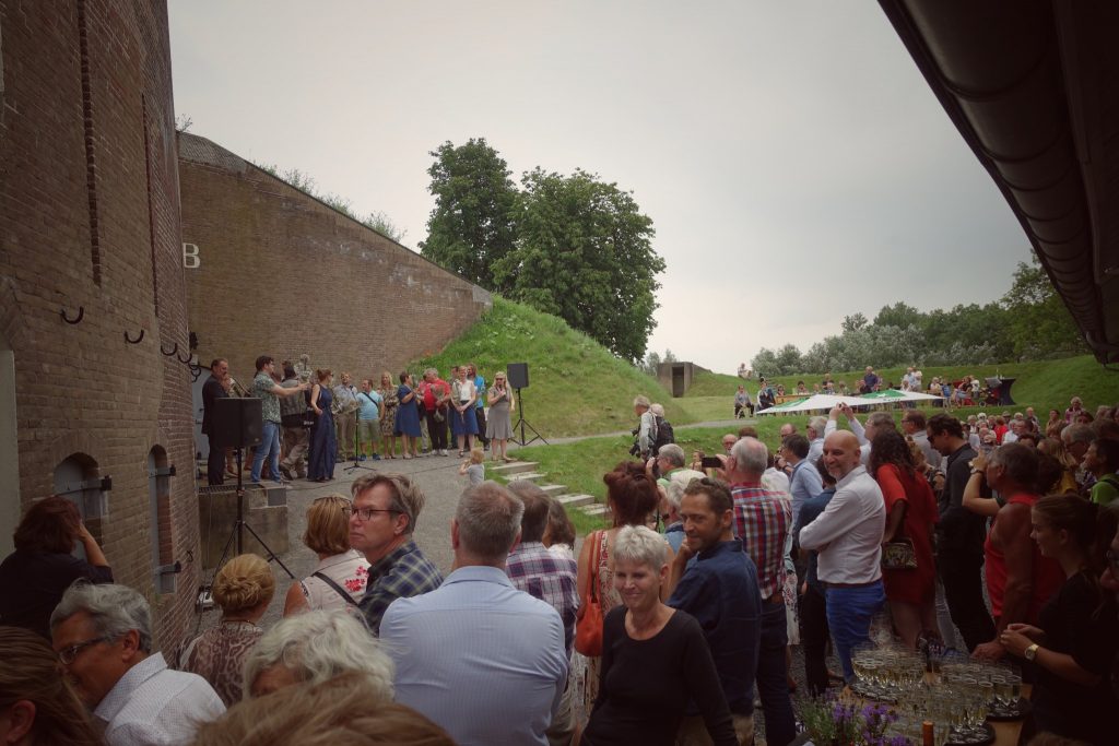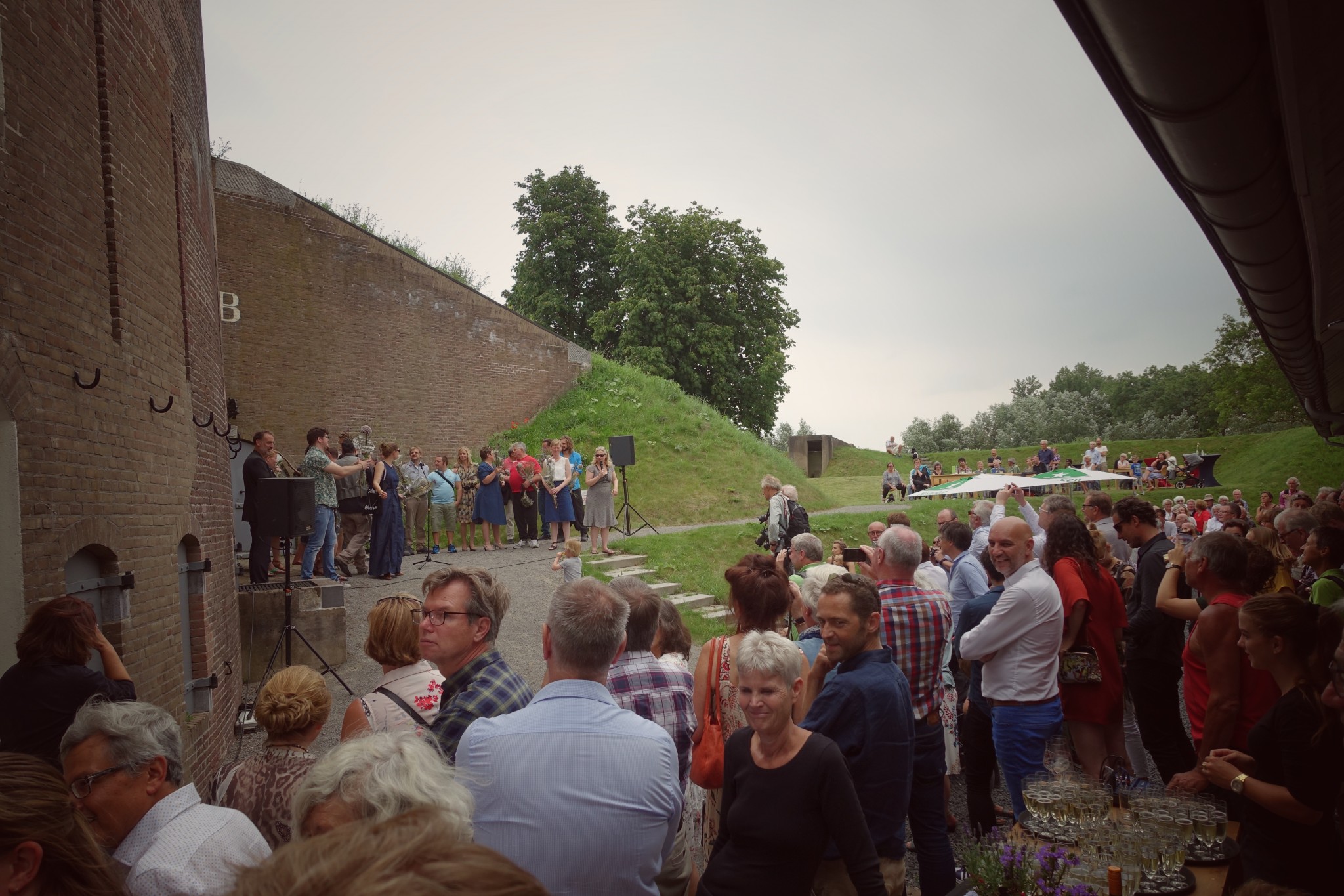 5:17 pm: Einar dressed in a green blazer and Jamex in a button-up, they retrace their bicycle route back to the fort less than an hour and a half later. A typical Dutch parking lot of hundreds of bikes lined up on the grass circles back around the old fort. The opening ceremony is in full swing. “They just called your name!” a fellow glassblower merrily pats Einar on the back as they walk up to over 200 people sprawled out on the other side of the fort. Not bad for a city of 20 thousand! As they squeeze up to the front to get a handle on whether they are supposed to do something, the tool room volunteer very gravely whispers in my ear—the Dutch guttural “h” particularly heavy: “The HHHorse fell over…” I whisper the news to Jamex who instantaneously disappears, right as the brothers are called up to the stage. Switching to English, the emcee welcomes the brothers… Einar, standing solo, looks questioningly around for Jamex, who unbeknownst to Einar is aiding the fallen horse. After the usual pleasantries are exchanged, champagne is passed around to all 200 attendees and Jamex is suddenly among the artists, the quinceañera stegosaurus standing once again before everyone spills into the fort. Walking into their main room now crowded with people, Einar looks over at the horse sitting on the low table. “Why isn’t that in the window?!” In the crush of people, there’s no time to tell him and I chuckle to myself as the horse makes its way back into the spotlight, the only piece completely devoid of glass.