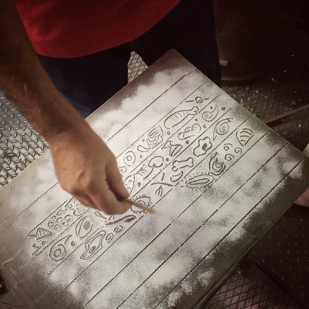Einar laid out the powdered colored glass on the metal work table and began drawing hieroglyph-like images. Jamex joined him and the two worked on the drawing together, taking turns or simultaneously drawing out the designs before the picture was rolled onto a molten glass bubble. At this point, I found a vulva snuck into the little drawings. “Hey! What is that?!” I teased. Einar just smiled with de la Torre pride; both brothers enjoy sneaking in hidden gems or little jokes to discover. The naughtier the better!