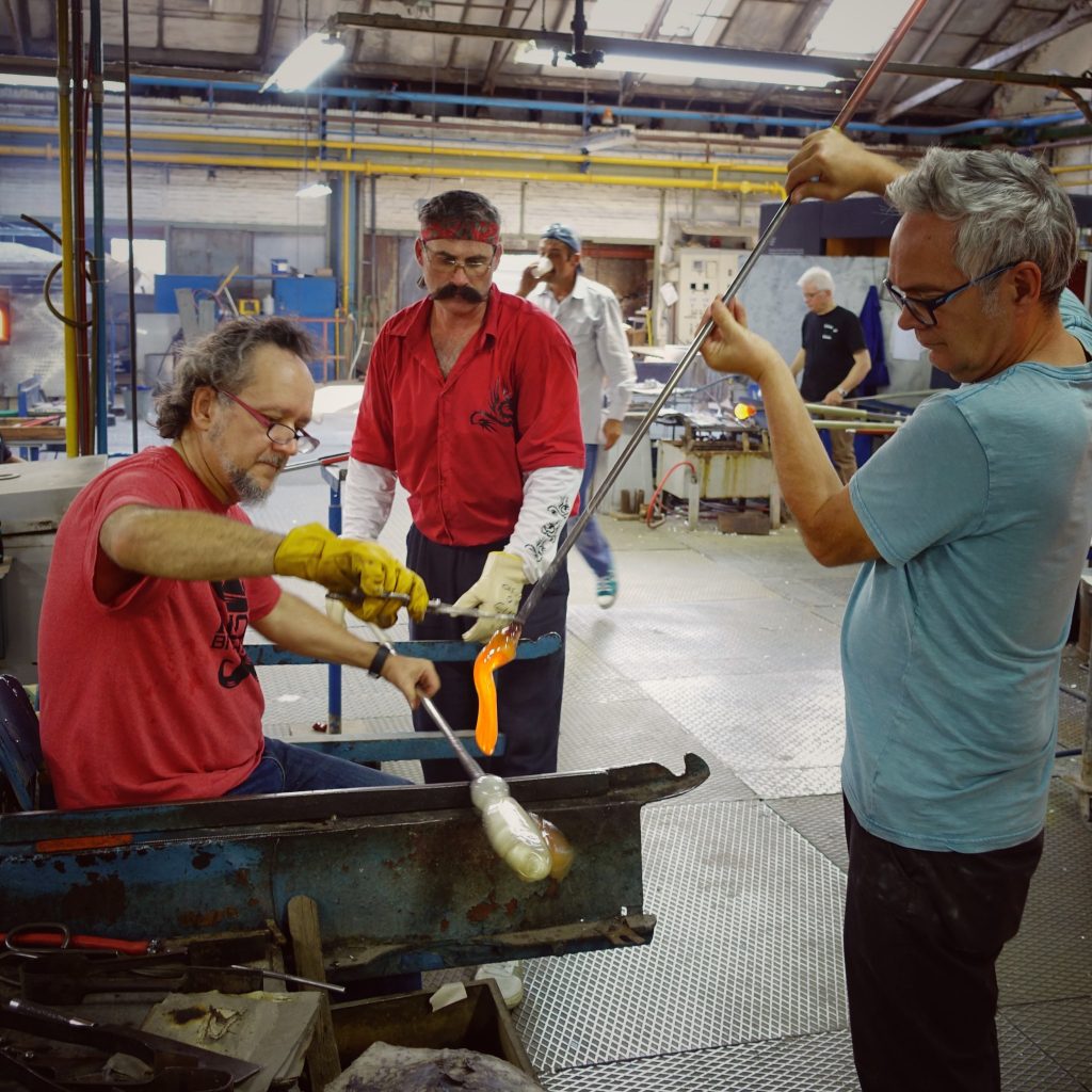 Between them and their four assistants, five languages were spoken throughout the day: Spanish, English, Romanian, Turkish and Dutch. Hand signs were paramount as much was lost in translation. Two of the assistants were the Romanian brothers Constantin and Vacyli with their magnificent musketeer mustaches. They were ecstatic to be working with glass again after the glass shop in their town closed and to make ends meet had to become farmers. Constantin wore leather gloves the whole day—unusual, because most glass blowers only wear a right glove, and only when they are sitting on the bench, close to the molten glass. With a big smile, Einar tells Jamex that Constantin likes to keep his hands soft for his wife. “Damn! That’s the best thing I’ve ever heard—taking care of his wife like that!” Einar added and they both chuckled and smiled approvingly at Constantin’s chivalry; his old-fashioned gesture mirroring their own traditional Mexican romantics. Even though it was the last day in a long week of blowing glass, there was high energy and excitement as one set of brothers assisted the other, everyone obviously enjoying working together.
