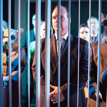 Costumer Jennifer Brawn Gittings, a local favorite whom the word inventive can always be applied to, bring laughter to the script’s dreamlike parables. Enron’s susceptible board members are the three blind mice; the greedy and persuadable Lehman Brothers firm are Tweedle-Dee and Tweedle-Dum in a single business suit, while the lawyers have a valley-girl drawl and gauzy Lazy Justice blindfolds.