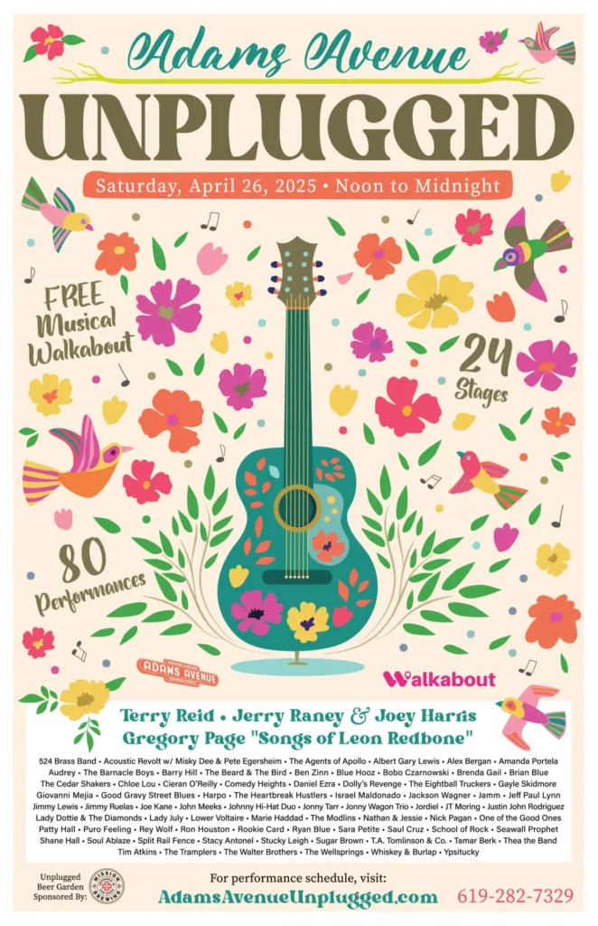 On April 26, 2025, AABA will host the free musical walkabout, Adams Avenue Unplugged. This event features 80 live musical performances inside restaurants, bars, and coffee houses along a two-mile stretch of Adams Avenue from University Heights on the West, through Normal Heights, and into parts of Kensington to the East. It also has performances outdoors at various patio locations, including the Smitty’s Food Court and Lestat’s Coffeehouse. The AABA hopes to treat musical aficionados and foodies to the rich neighborhood culture.