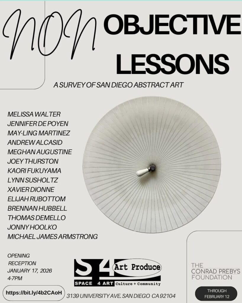 Non-Objective Lessons: A Survey of San Diego Abstract Art celebrates the region’s long-standing tradition of abstraction, experimentation, and boundary-pushing artistic inquiry. Drawing inspiration from influential figures such as John Baldessari, Robert Irwin, and Bob Matheny, the exhibition brings together artists who continue San Diego’s legacy of conceptual play, non-objective exploration, and material rebellion. Through assemblage, minimalism, and unexpected interventions, the featured works examine the tension between structure and improvisation, and the joyful misbehavior that defines much of the city’s avant-garde.