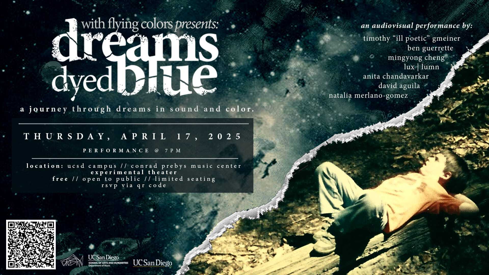 “Dreams Dyed Blue” is a spatialized electroacoustic/hip-hop audiovisual performance that explores the beauty, sadness, joy and loss of reaching toward a dream. This collaborative experience features visual contributions from Ben Guerrette, Mingyong Cheng, and LUX|LUMN, as well as musical contributions from Anita Chandavarkar, Natalia Merlano Gomez, David Aguila and Timothy “Ill Poetic” Gmeiner.