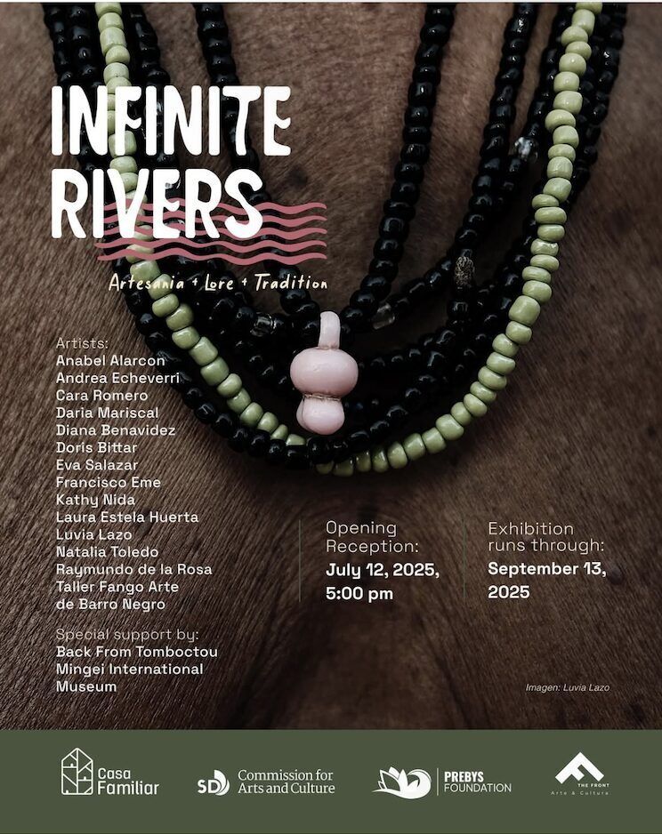 Casa Familiar presents Infinite Rivers, an exhibition honoring ancestral craftsmanship and evolving artisanal traditions across generations. Featuring Indigenous artists from the Kumeyaay, Zapotec, Huichol, and other communities, as well as artists from San Diego, Tijuana, Lebanon, and Colombia. Curated by Francisco Eme, the show runs July 12–Sept. 13, 2025, at The FRONT Gallery in San Ysidro. Opening reception: July 12, 5–7 PM, with a special appearance by Colombian artist and musician Andrea Echeverri.