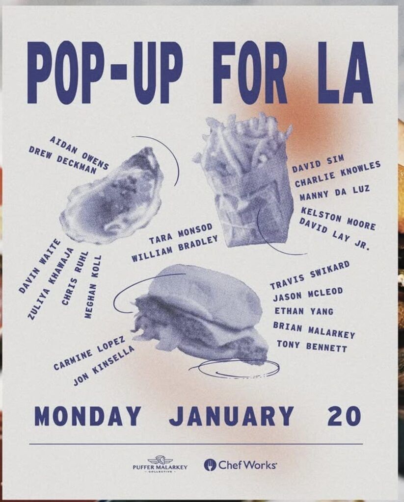 Help us support our neighbors & loved ones in LA. 100% of money raised goes to World Central Kitchen to support their efforts to feed first responders and families impacted by the fires. Your $50 donation gets you: smash burgers, oysters, and fries from San Diego’s best chefs. Cocktails, beer, & wine will be available a la carte with all money going to WCK. Dropoff donations will be accepted at the door. Additionally, our partner, Chef Works, is matching the first $10k raised.