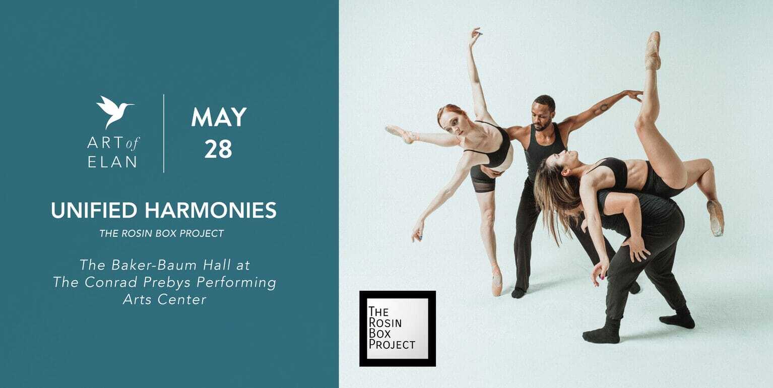 Art of Elan is thrilled to partner with San Diego’s premier contemporary ballet company, The Rosin Box Project, for two special performances of “Unified Harmonies,” a multidisciplinary production that features new choreography alongside the stunning string quartet works of Pulitzer Prize-winning composer Caroline Shaw and Kian Ravaei, exploring the crucial role of artists as changemakers and emphasizing the importance of collaboration in today’s world.