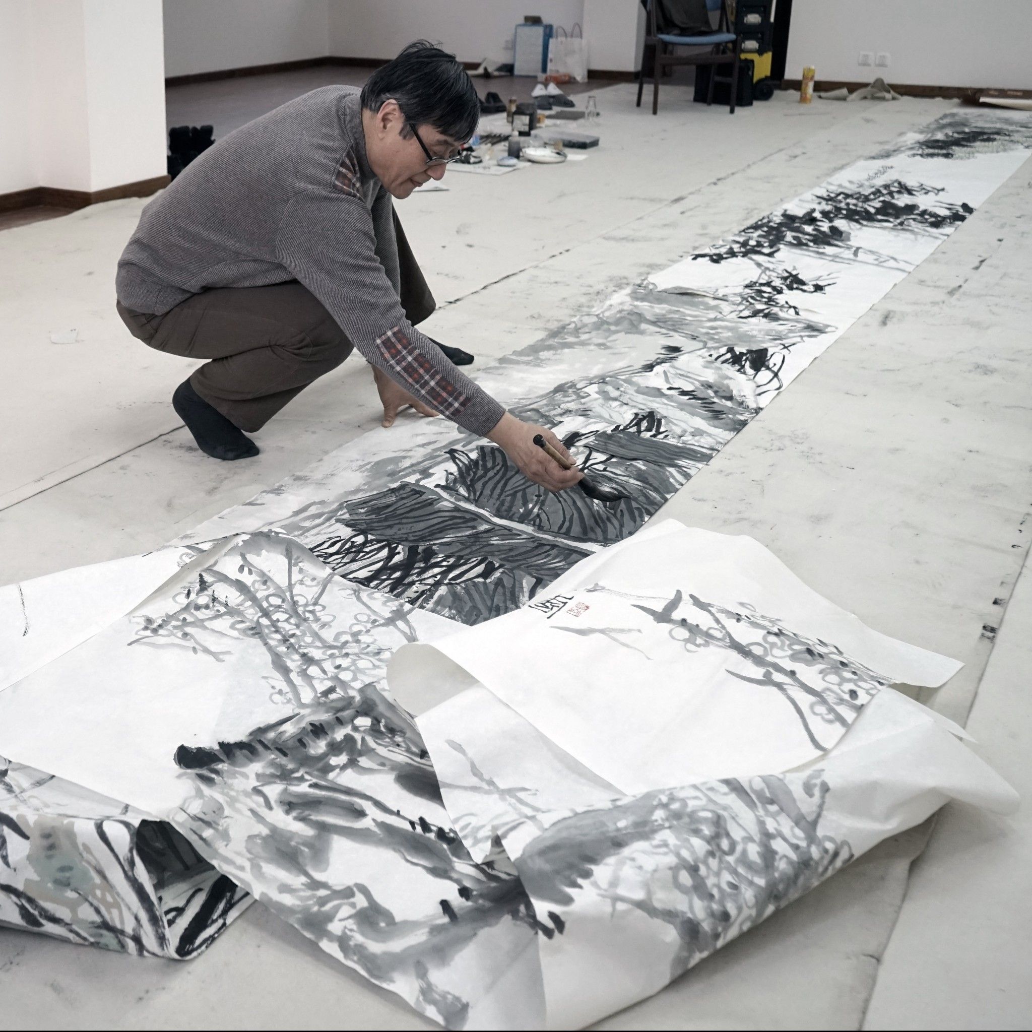 Chinese artist Pan Gongkai follows in the footsteps of his father and celebrated Chinese painter, Pan Tianshou. Though Tianshou suffered persecution during the Cultural Revolution (1966-1976), he went on to create a large body of work in the tradition of brush and ink painting, influencing his son. Pan Gongkai’s Noble Virtues depicts “the four gentlemen”(si junzi): plum blossoms, orchids, bamboo, and chrysanthemums. Gongkai’s fifteen meter scroll of ink on rice paper was hand carried in sections and then framed as one long narrow work, elegantly displayed on the wall of Gallery 15, a public area adjacent to Panama 66 and the May S. Marcy Sculpture Court. The scroll which reads right to left, represents the four seasons – the resilience of plum blossoms in winter, the delicate elegance of springtime orchids, the strength and flexibility of bamboo in summer, and the chrysanthemums defiantly blooming in autumn under the approaching winter chill.