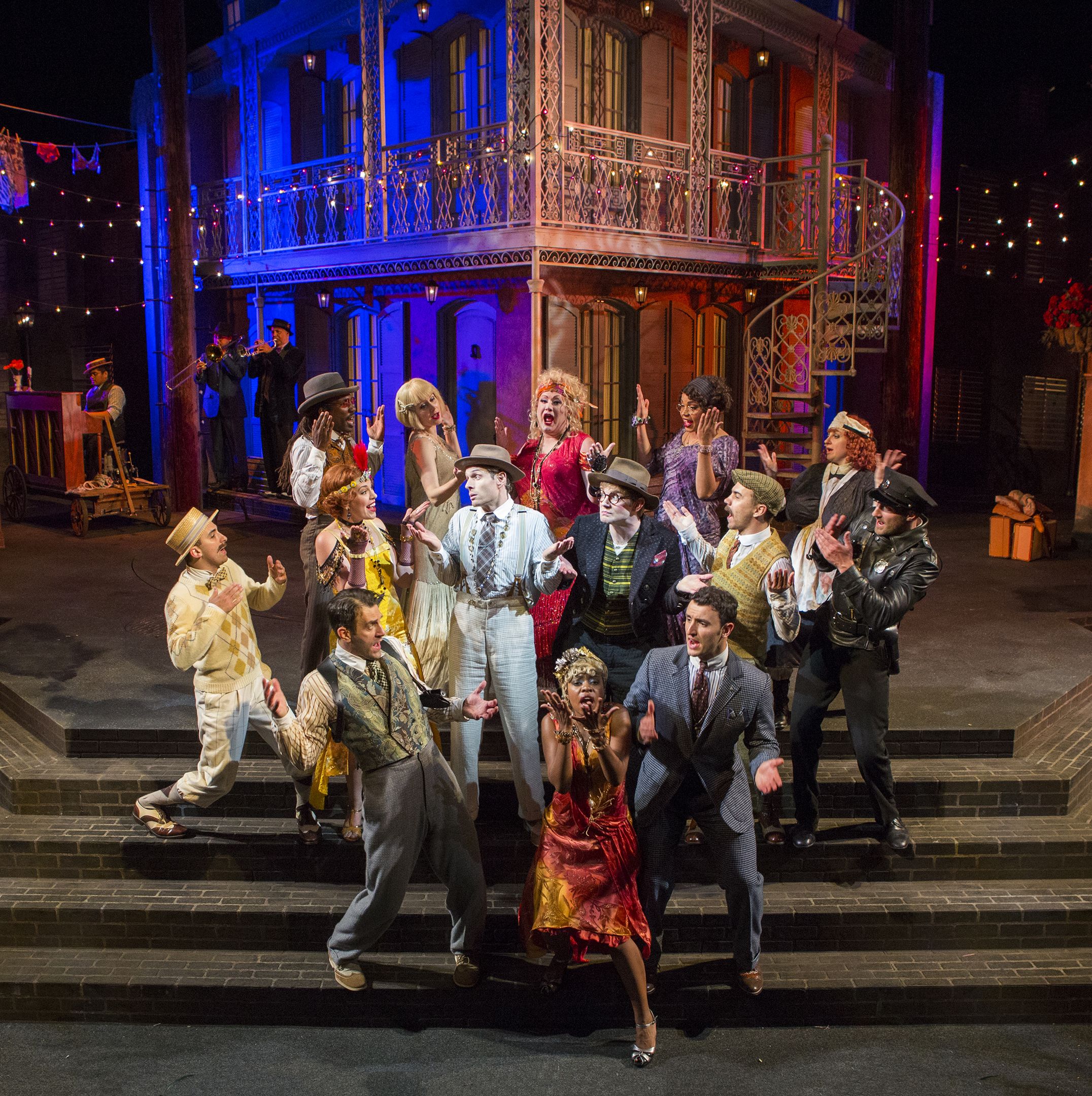 This is also one of those rare productions where the set works almost as hard as the actors. Designed by Alexander Dodge, the smallish outdoor theatre stage plays host to beautiful facsimiles of iconic French Quarter architecture with the high windows and gorgeous iron lacework balconies. The main house does double duty as a revolving set turns it from exterior to parlor in seconds while the space between the buildings give off the real feel of alleyways. Linda Cho’s costumes hit the right note with meticulous attention to detail and class. The women’s ‘20’s shifts move with their emotions and the men’s suits are just the right degree of sharp and classy.