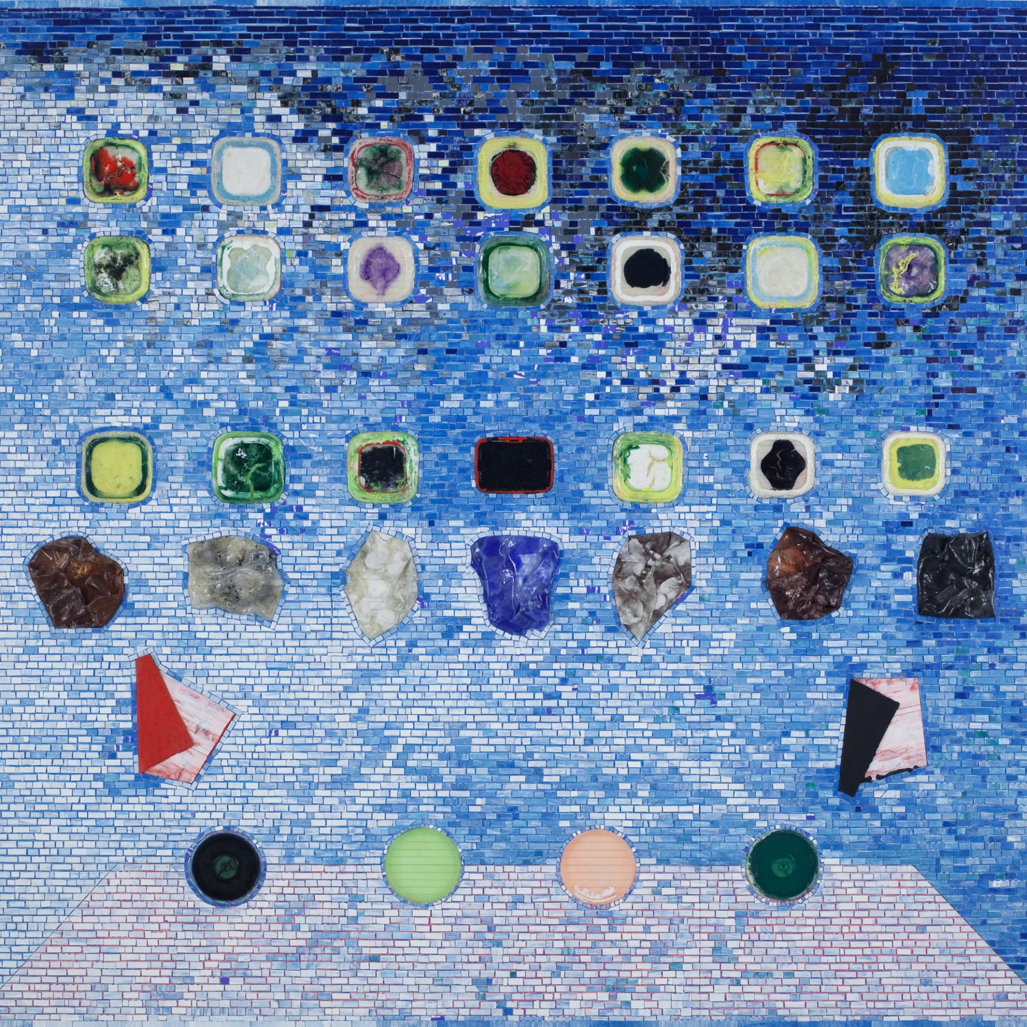 Whitten continues to use his broad based experiments with paint to express his philosophies about history and culture, and his concepts of space and personal identity. His black and white paintings of the 60’s are minimal, lending an out-of-focus photographic quality to seemingly “ghost imagery”. The 70’s paintings consist of thick layered paint surfaces that have been raked, trowelled and leveled like concrete, of varying color combinations but are clearly experiments in the viscosity, material and substance of paint. Whitten’s paintings from the 80’s appear to be explorations with the composition of paint and casting, creating new surfaces and textures. Whitten’s works from the 90’s and 2000’s are primarily tessellated paintings resembling ancient mosaics and seem to be influenced by the significant time Whitten spends in Greece.