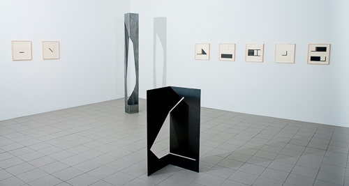 Standing among the free-standing sculptures, ink on paper and steel drawings, and wall sculpture works by Kenneth Capps, we are reminded of artists Brancusi, Donald Judd and Robert Morris whose works fed the engine of minimalism during the mid to later twentieth century. Capps continues that line in his homage to this movement in his highly focused art practice of the past four decades. Known for his wood and steel public art, in this exhibition Capps highlights steel and chrome, and ink on paper as his primary materials while the sphere, triangle, and square become his primary shapes. Therein he explores the opposites of forms: rectilinear/curvilinear,convex/concave, positive/negative, and open/closed spaces. “Line” is the common denominator in all the works shown, whether they are painted, drawn or cut into steel or chrome. His lines travel in many directions, often bursts of short lines of varying thicknesses cut into steel that move in and out of three dimensional space within surfaces. While the works are limited in their color palette to mostly black, and dark steel, there is an array of surface variations of polished and shiny chrome, dull, and subtle modeled areas. There is also an investigation of space in both the works on paper and sculpture. Capps’s works on paper appear to be more of a way of exploring line and symbols in preparation for creating sculpture than stand alone pieces. There are three drawings on paper that stand apart from the others which are “Cast”, “Study for D Side” and “Study for the Distortion of the Square”, all created in 1975. These ink drawings reveal the ‘hand of the artist’ as they are roughly drawn, possess variations in color tones and exhibit mark-making rather than the straightforward filled in lines of his other drawings. Simplicity and economy of design best describe Kenneth Capp’s work in this exhibition.