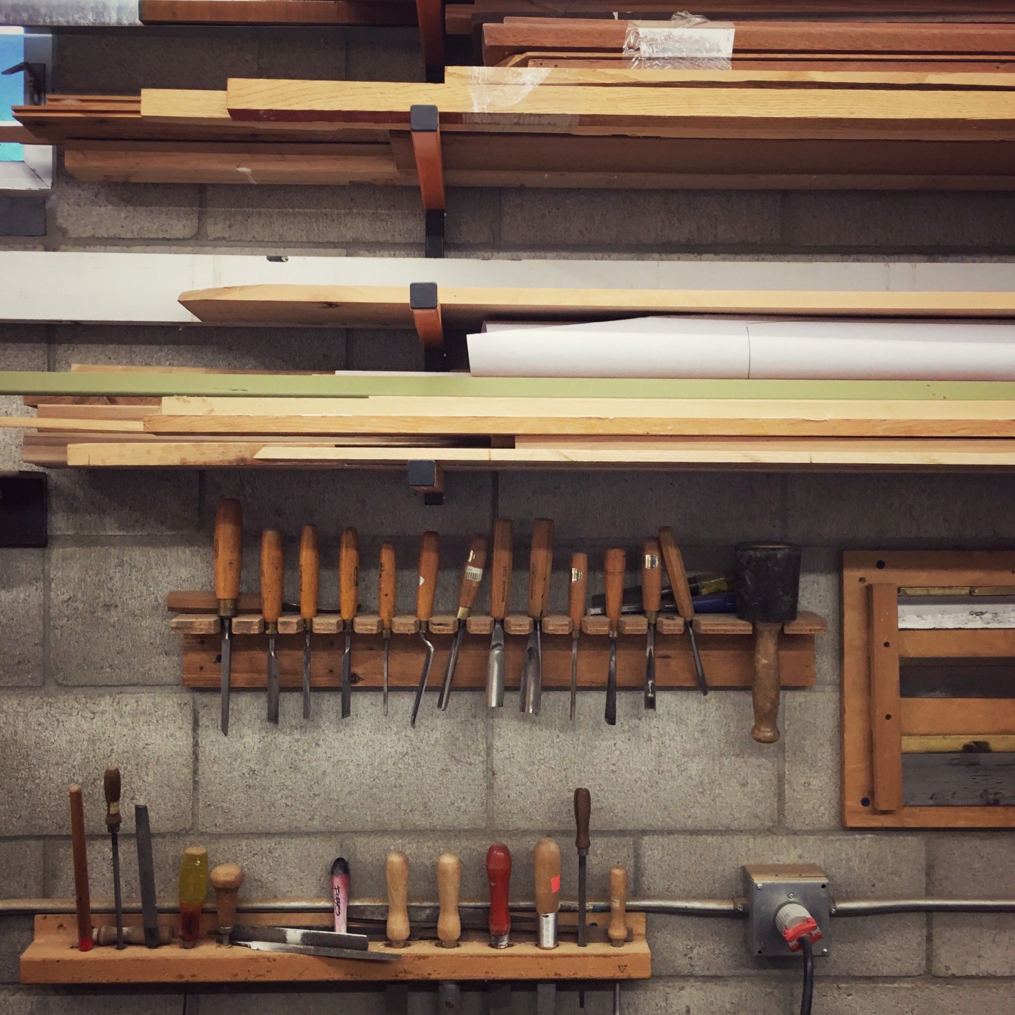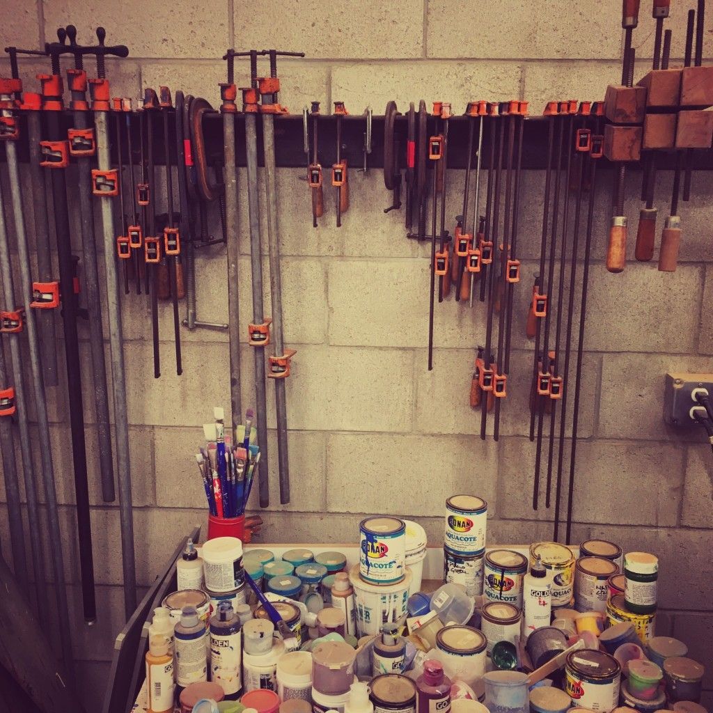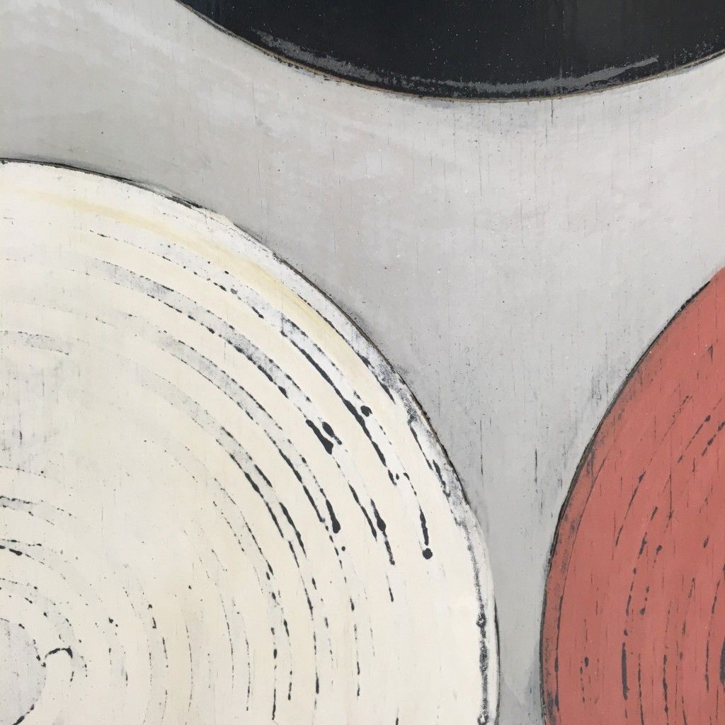 On the opposing wall is a large painting of circles in subtle blues, pinks and yellows peeking through gray. He explains that when the initial paint is wet, he drags the designs into the paint to create grooves for the next layer of gray paint to fill. Sanding off the top layer produces the beautiful soft-hued geometric patterns. After explaining his technique he removes the painting from the wall revealing a little secret. The painting is hanging on a wooden framework, which holds four long pieces of wood that he slides out and then screws into the corners of the painting. It’s a table disguised as wall decor! I enjoy this little space-saving ruse as much of his furniture design and visual art have playful treasures to discover if you explore a bit.