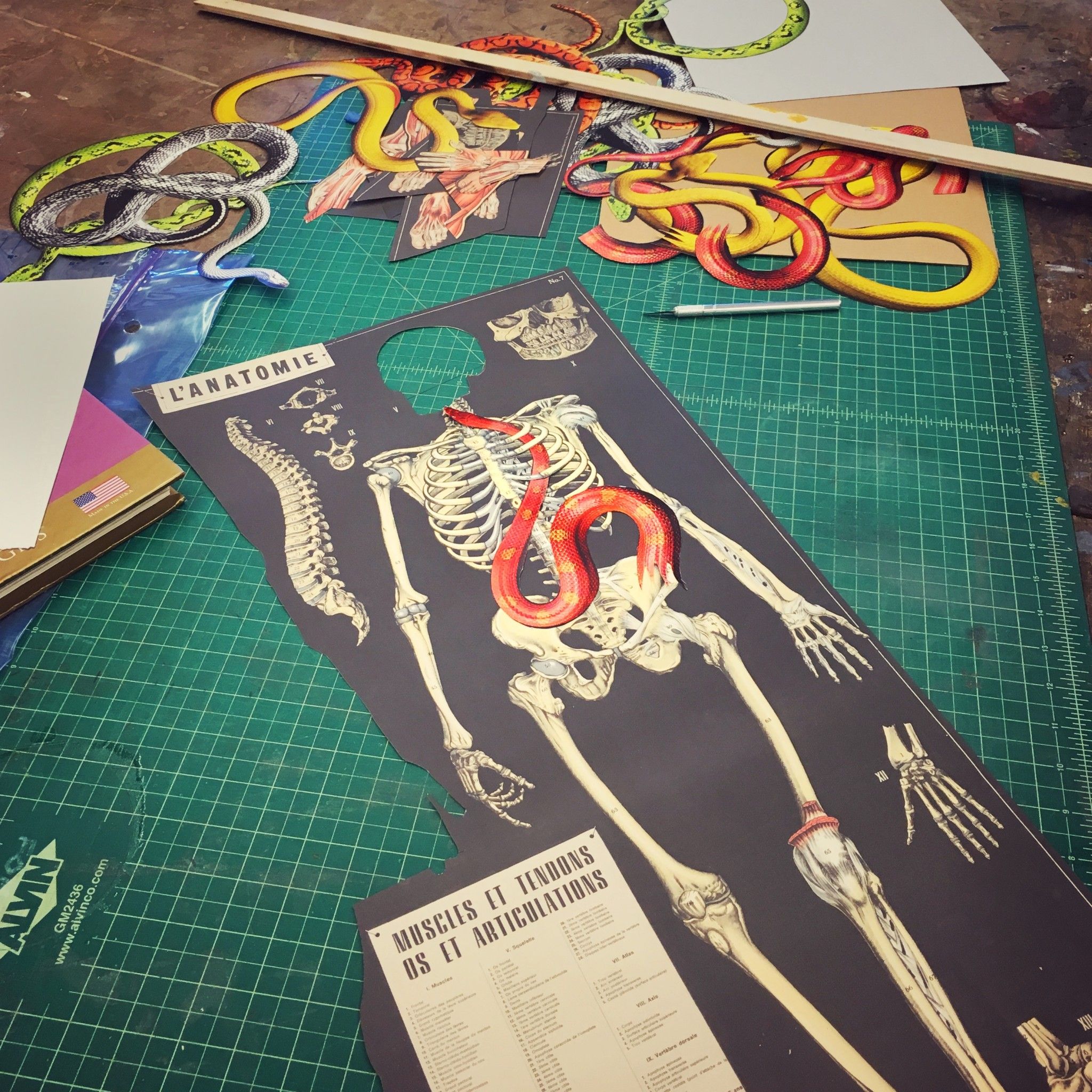 We walk down the narrow handcrafted stairway to his studio. A staging area fitted with gallery lighting is set up on the back wall. The other walls are covered with woodworking tools, meticulously organized in a fascinating array of shapes and sizes. On his worktable, mismatched collage pieces of snakes and antique skeleton renderings are strewn about or lie half entwined in a beautiful play of color and gross anatomy. Fobes explains that he is working on a series of mythological pairs. The scraps of snakes and human bones will soon be a piece on Adam and Eve. A finished collage piece with Cain and Abel graces the back wall alongside other pieces representing unfortunate pairs from classic mythology. The work is constructed from carefully cut and seamlessly matched pieces of wallpaper that Fobes has collected from old books of wallpaper samples. As to be expected in such an organized studio, he has the pages arranged by color in flat files for ease of use. I’m curious about his reasons for being drawn to the subject of pairs. He reveals that he is an identical twin, and that over the years, he has noticed his work generally consisted of pairs. Many of his furniture pieces have a corresponding second piece or double format as well. He feels his brain is somehow subconsciously balanced on a bilateral symmetry and it naturally comes out in his creative process.