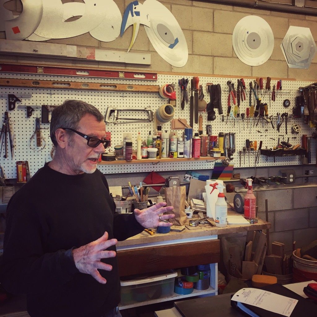 David Fobes walks me through his 1920’s Spanish Revival Bungalow to its modern addition. This section of the home, with its tall, open ceilings was designed with architect James Brown in order to expand the backside of the house. Floor to ceiling windows overlook the canyon, and a stylish metal grate separates the bedroom from the living room with a flip-around TV – allowing him and his wife to watch the telly from either side. His personal creative history is evident in this play with space. He received both his B.A in Environmental Design in 1978 and his MFA in Art , 1994 from the SDSU School of Art + Design. Environmental Design is now a defunct major at SDSU, but Fobes praises the way it taught the students a thinking process that questioned the status quo. Transferring from a nuts-and-bolts architecture education at San Bernardino Valley College, he was thrilled to be asked to think in new ways by his professor and lifelong mentor Eugene Ray, whom he still meets with to this day. Adding to this unusual education, his first job out of school was working for the famous architect Ken Kellogg, the innovator of Organic Architecture known for its fantastic curves and unusual structures. Working with Kellogg immediately immersed Fobes into what he refers to as “weird and challenging building projects.”