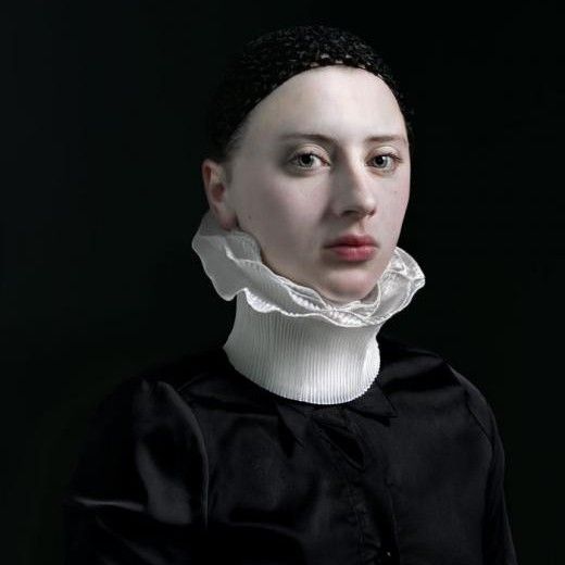 Since 1995, Dutch photographer Hendrik Kerstens has been photographing his daughter, Paula. Kerstens’s approach is a mix of painting and photography, borrowing traditional dark background poses, the careful handling of light, and the subtle treatment of skin from the masters of 15th century Dutch portraiture. He blends them together with accessories including a bubble wrap headdress, a plastic shopping bag cap, cloth napkin and towel hats, a carefully arranged aluminum foil head-cover, and a collection of doilies stacked around Paula’s neck mimicking ‘old world’ starched collars.