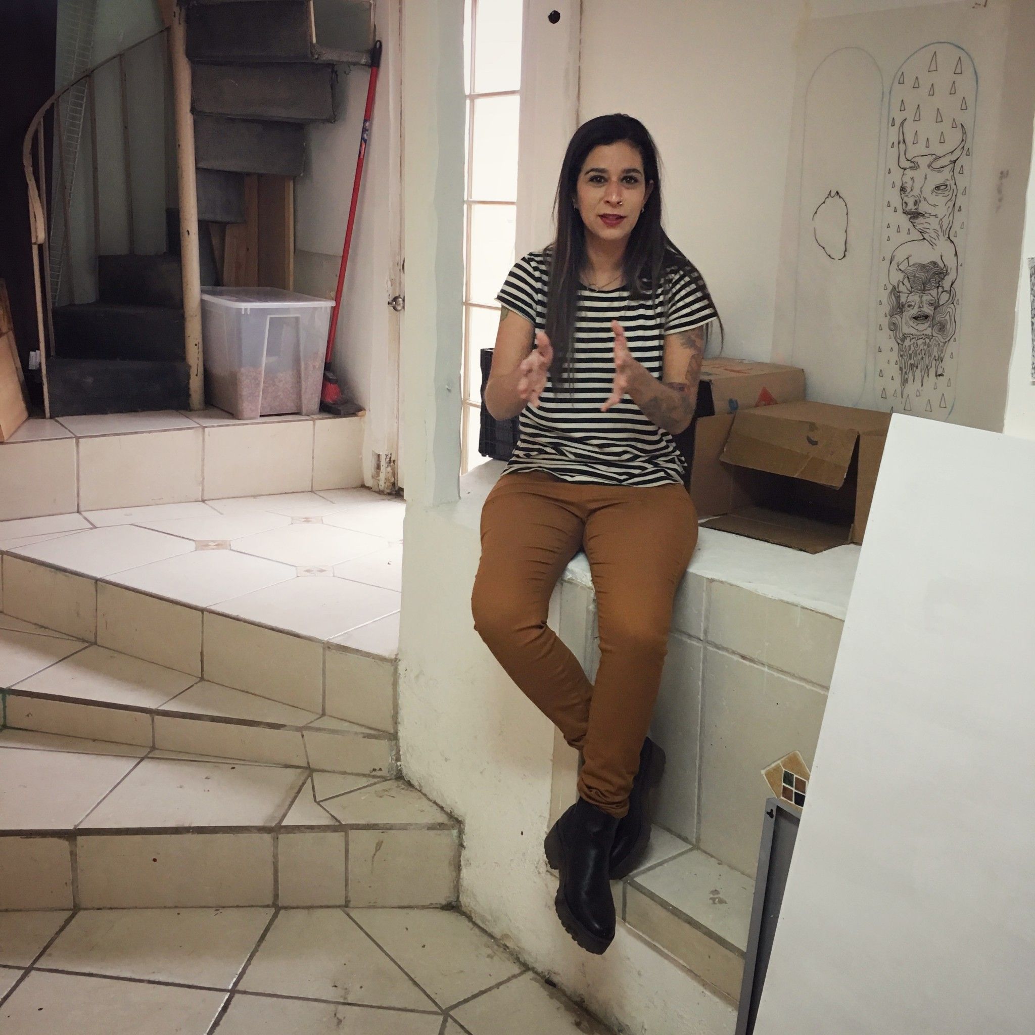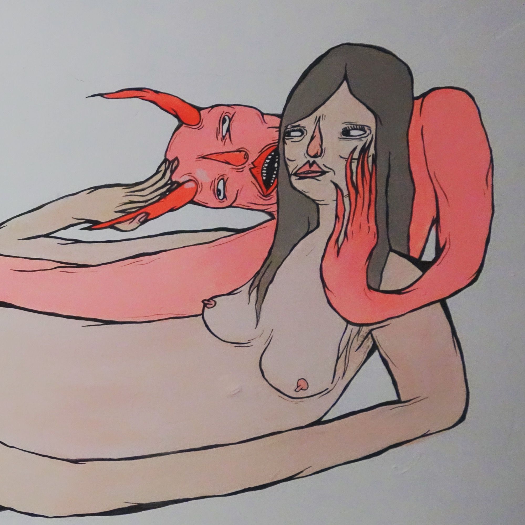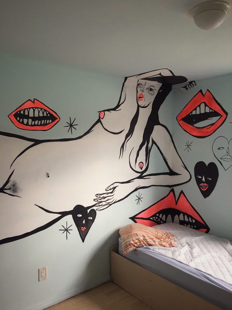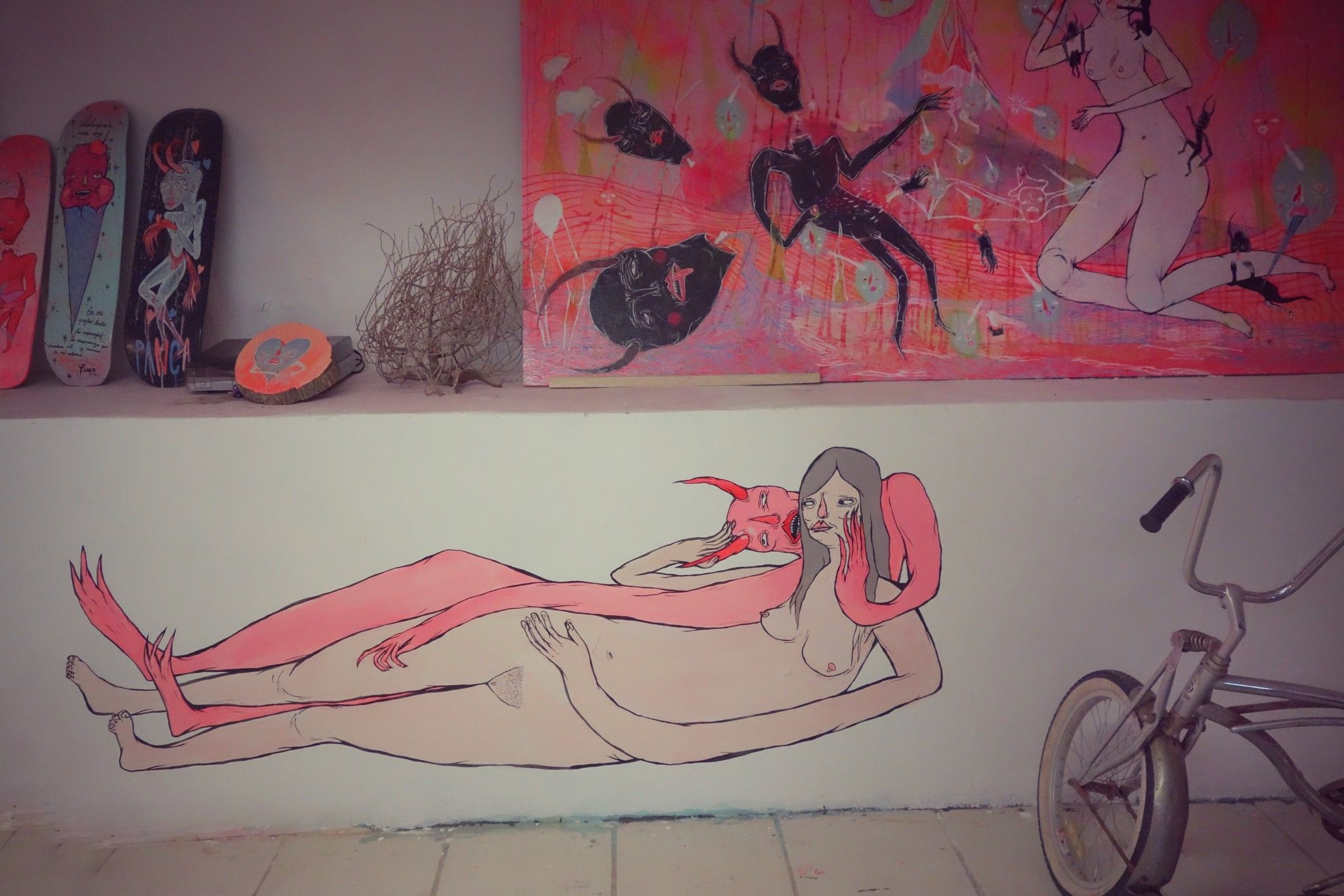 A perfect example of Panca’s distinct style is painted on the wall of her studio. A devil cozies up behind a reclining nude female, his oddly elongated arm stretching all the way down the length of her naked body and rests on her inner thigh.The expression on the woman’s face as she looks at him is more unsure than scared; his eyes roll back in ecstasy as she pets his head, hooking a thumb around a horn. With simple lines and just a few colors, Panca is able to capture that feeling of flirting with an idea that perhaps one shouldn’t be flirting with… I find it remarkable that she has no formal art education, and yet can illustrate a human dilemma using iconographic figures with just a few strokes. The nude female, the devil—we have seen them a million times, but not like this.