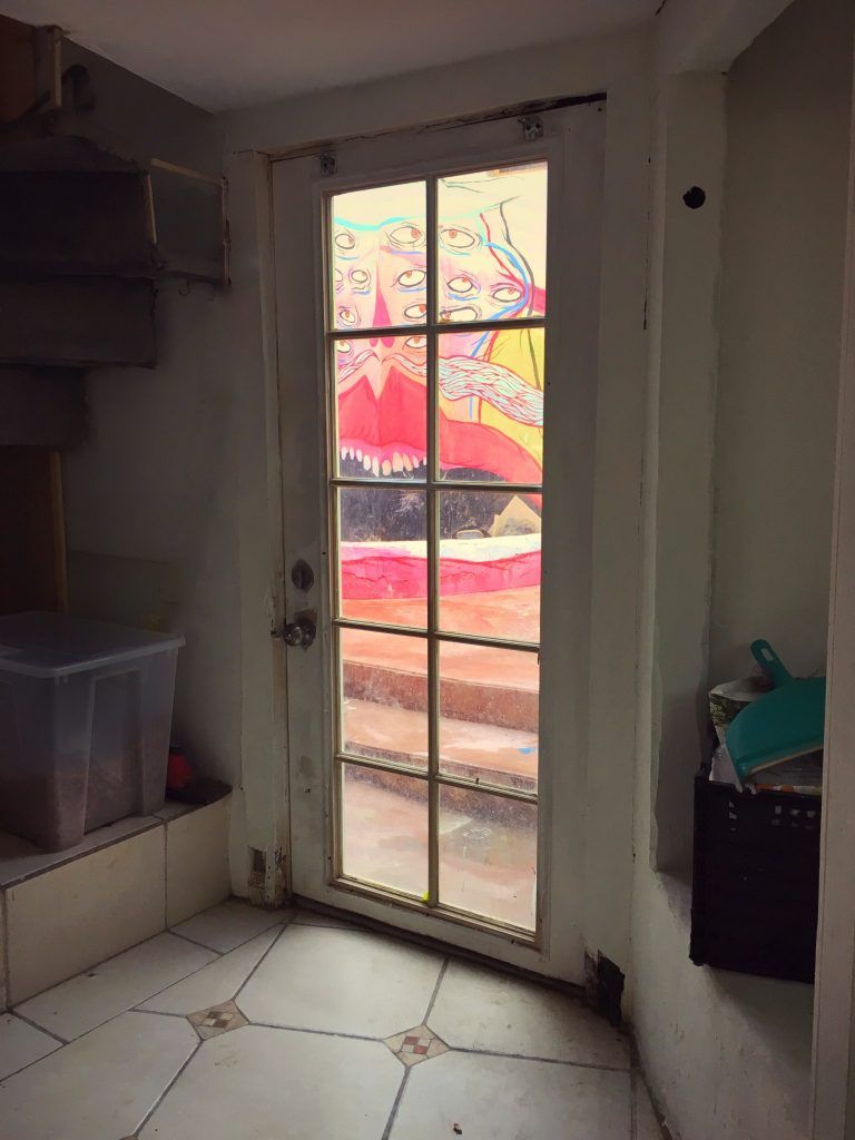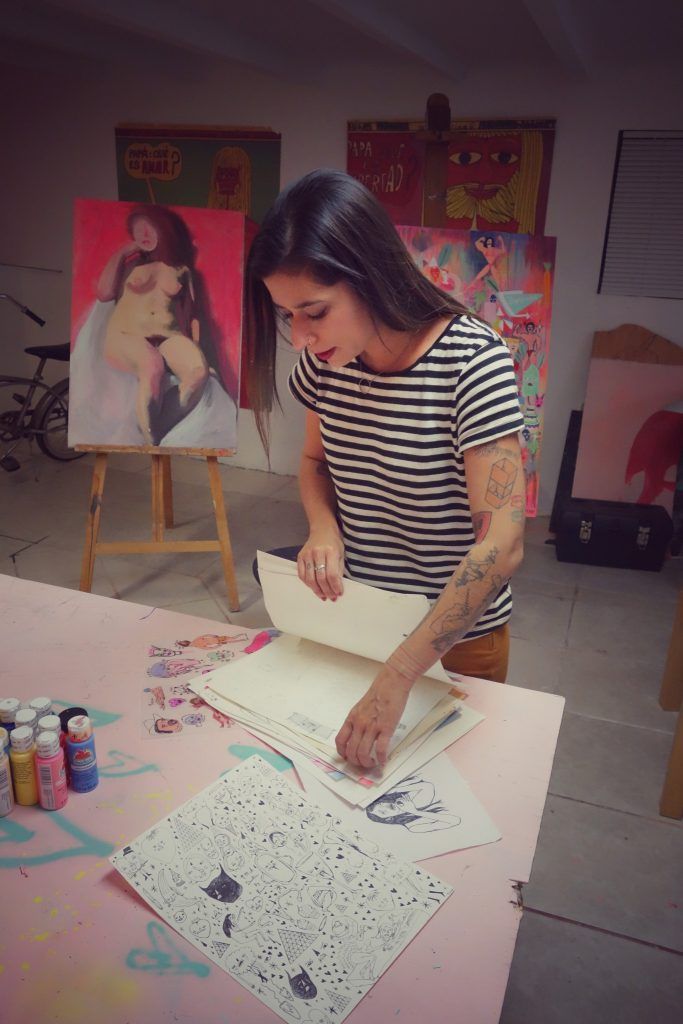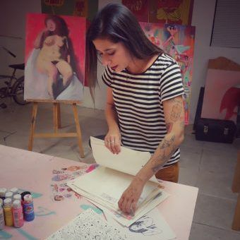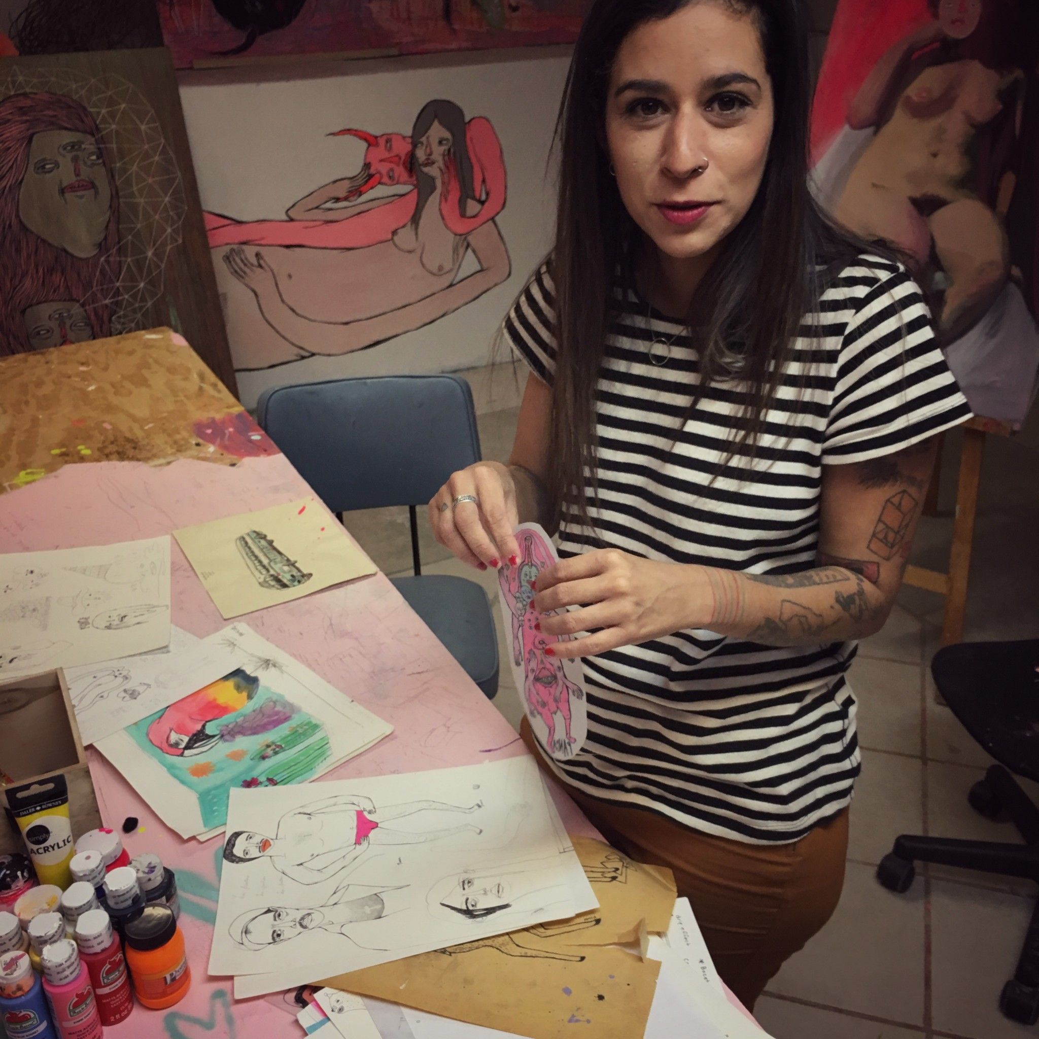 Paola “Panca” Villaseñor leads me down a metal spiral stairway into her basement studio. Painted on the outside patio wall in her trademark neon -pastels, a huge carnival-like face smiles maliciously through the glass door as soft light spills into her studio. Pink in every shade is visible on almost all surfaces. The feminine and playful color set against Panca’s distorted, almost grotesque faces and figures is an effective foil. Her work is not meant to be pretty. It’s meant to show the underbelly and raw side of life; and the heavy use of pink softens the blow, or intensifies it, as in her use of nude figures and misshapen anatomy. Panca, a well-known bi-national muralist, lives in a coastal suburb of Tijuana, and she has painted numerous murals on both sides of the border. Her art has graced the covers of the San Diego Reader and City Beat, and she was nominated as a 2016 San Diego Art Prize Emerging Artist.