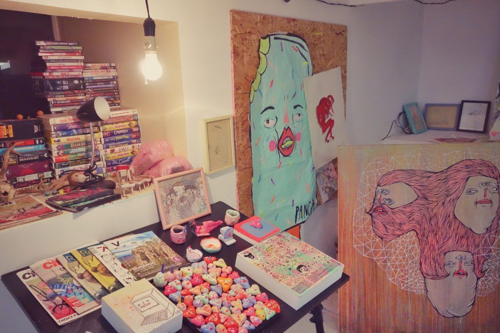 Her work generally starts with sketches; working ideas out on paper before beginning to paint. She explains that her brother and sister are almost a decade older than her, so she spent a lot of time doodling while sitting at the table with the adults. When she was five years old, an uncle said to her, “You’re an artist…you’re gonna be odd!” “I didn’t understand why he would say that,” Panca says. “It really pissed me off!” We laugh in acknowledgment that her uncle was right; artists can be special in their very own way.