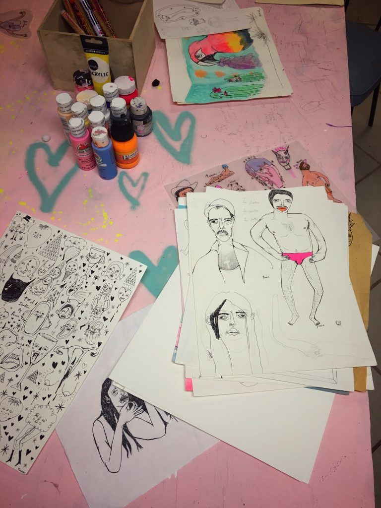 I ask to see her sketchbooks. She pauses, walks over to a corner and pulls back a canvas propped up against random boxes and plastic crates. “This is pretty much it, I just throw them over here,” she says. She grabs a stack of loose papers sliding off the top of a box. She lays a series of sketches out on the table: a skinny muscle man with bright pink underwear and a mustache, a monster eating something, figures talking and walking. I can’t help laughing to myself—what had looked like an unimportant stack of discarded junk was a treasure trove of gems.