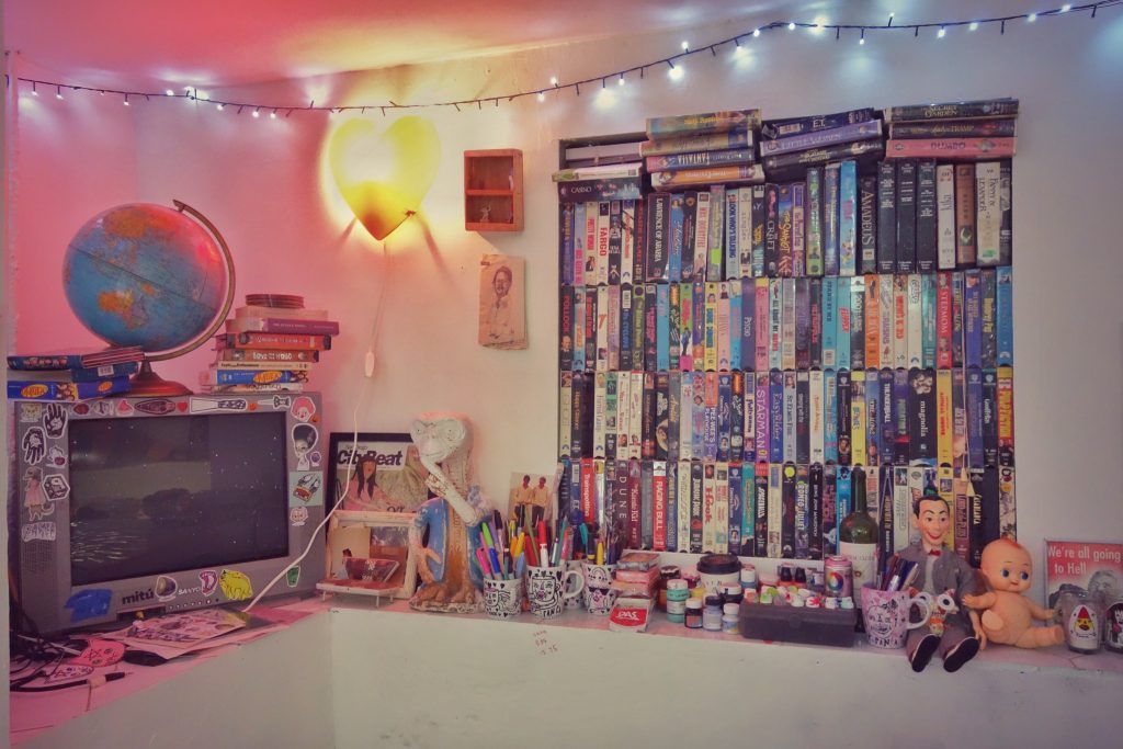 In one corner of Panca’s studio a string of Christmas lights hangs above a TV and a wall of VHS tapes. A Peewee Herman doll leans against them along with a kewpie doll and other oddities. She explains that the VHS tapes are part of her creative process. She usually puts on a movie when she sits down to work, taking comfort in the familiarity of a film from her childhood that she has seen a hundred times. As she works, she half pays attention to the movie reel she sees playing in her head. “I put on movies when it’s more lighthearted work, music when I really have to concentrate.”