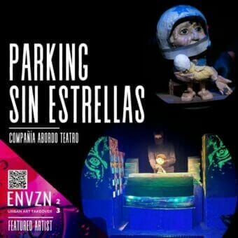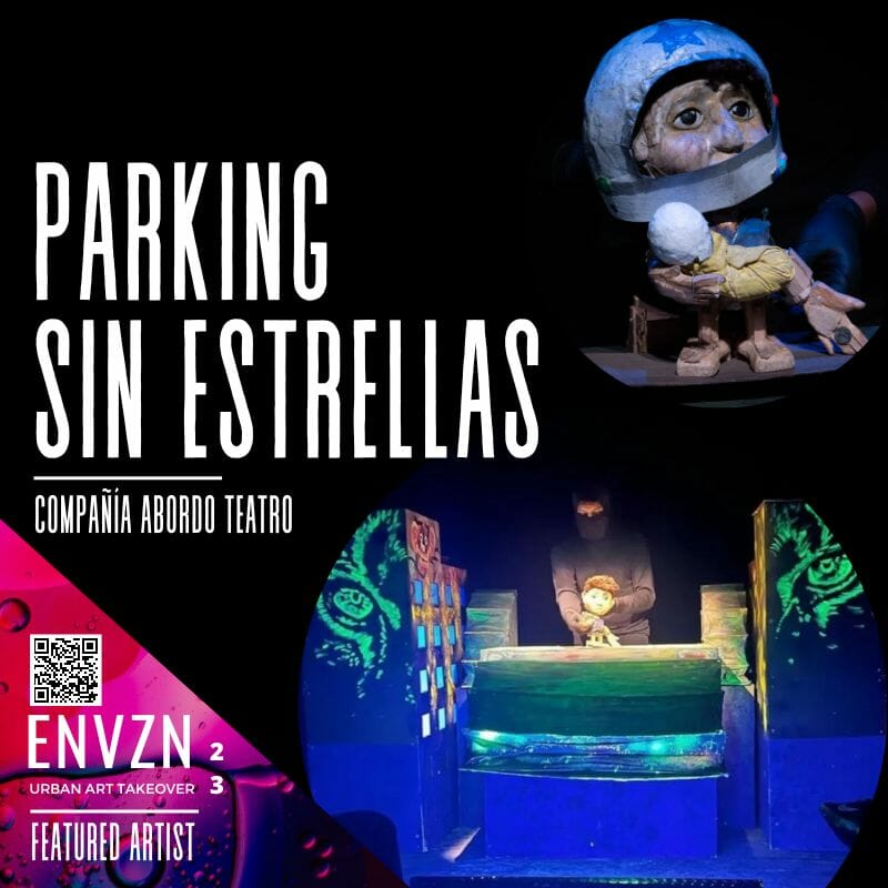 “Parking sin estrellas” es una obra de teatro con títeres que presenta la problemática observada en la Zona Norte de Tijuana (zona de tolerancia) en la que viven niñas y niños que se pueden ver a todas horas del día solas/os, caminando entre prostitutas, turistas, “sobre ruedas” (mercados callejeros), borrachos, puestos de tacos, puntos de comercio de drogas, casinos, mexican curious y mariachis. Esta confluencia caótica, tradicional, moderna y peligrosa nos hace pensar en la Zona Norte como una analogía a la selva, en la que cohabitan distintos ambientes, animales, peligros, presas y también cierta estética de lo grotesco. Las niñas y los niños de esta zona han aprendido estrategias de supervivencia, pero también siguen siendo pequeñas/os soñadoras/es a quienes les hemos arrojado a esa jungla y que, sin embargo, no dejan de imaginar sobre posibilidades fantásticas. Acompaña al pequeño protagonista en su excursión entre la caótica y peligrosa “selva citadina” de la Zona Norte y viaja en el espacio sideral como metáfora de sus sueños – un escape de este mundo salvaje a través de la bella imaginación propia de la infancia.