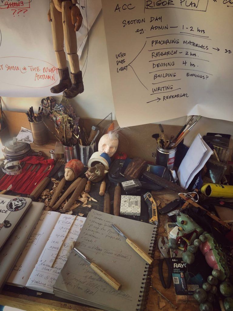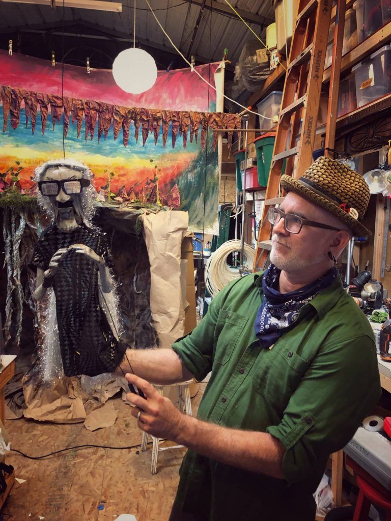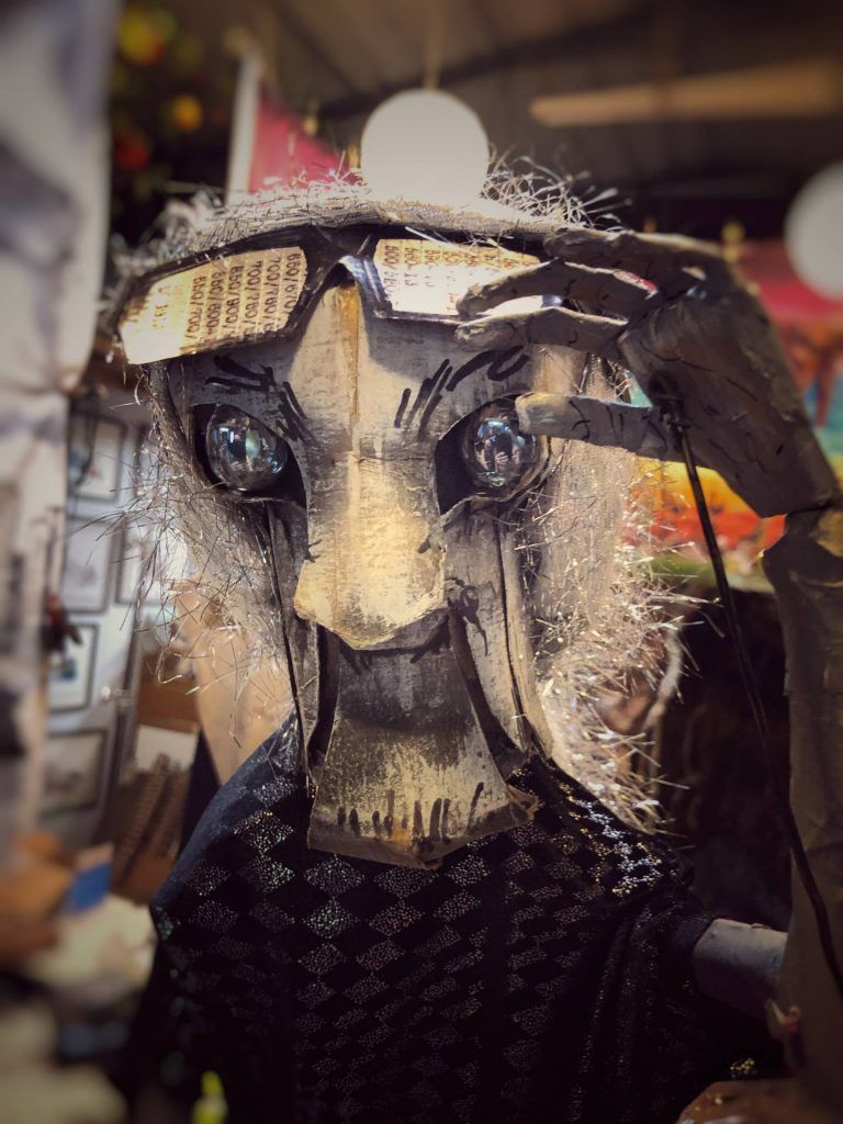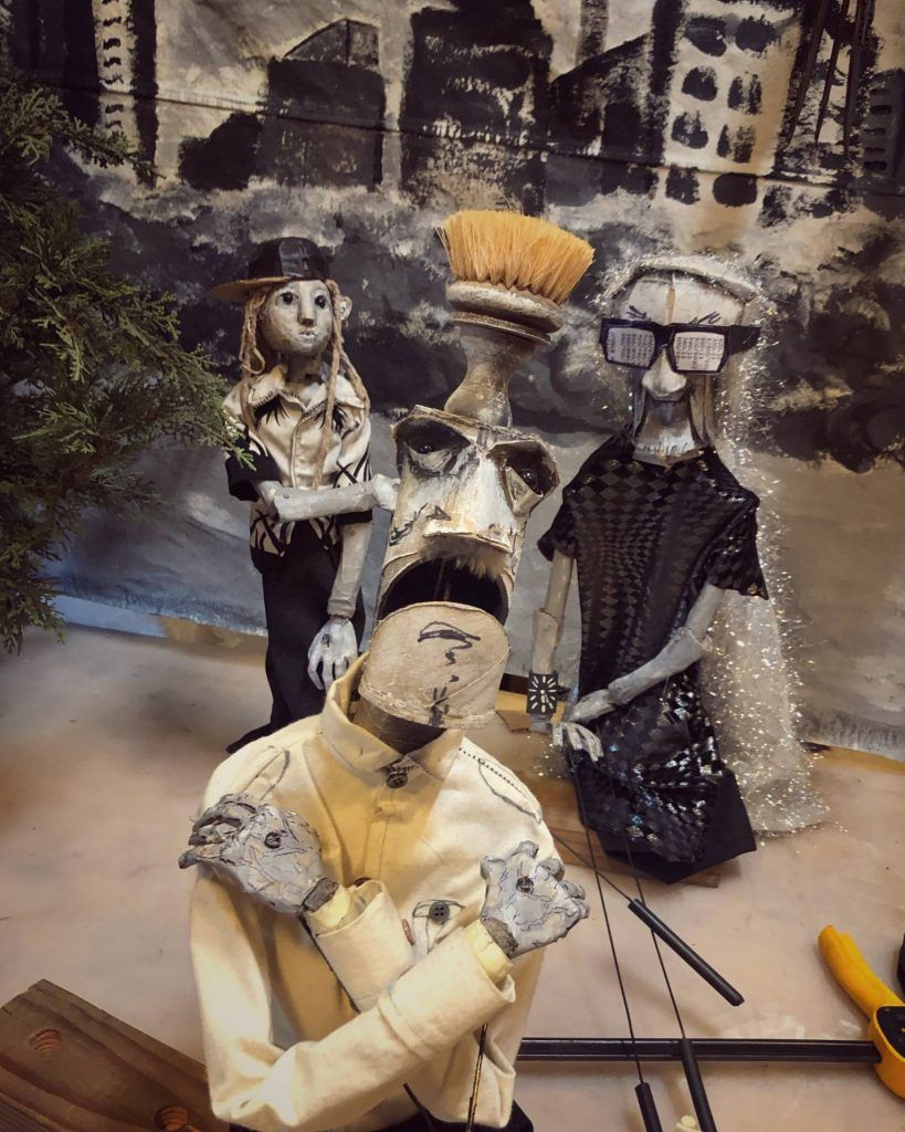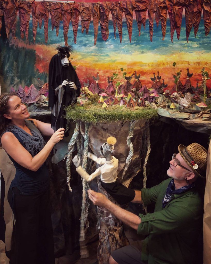 “It’s the ultimate mixed media: craft, performance, plot,” says Gunn, as he shaves off a bit of wood from a solid wooden head he’s been patiently working on as we talk. Rountree and Gunn create everything they use in their puppetry by hand, mostly from cardboard, castoffs, and trash, consciously or subconsciously relishing the life history of the rubbish. Tellingly, their first date was making cardboard sculptures until two in the morning, “and then we pretty much were inseparable,” laughs Rountree. Both studied literature and art, the right mix of disciplines to weave intellectual subplots, adult themes, and political commentary while avoiding heavy-handed moralizing. With a deep respect for the interpretation of the viewer, their thought-provoking work retains the power to inspire childhood wonder. I ask where their stories come from: “Are they made up out of thin air, based on mythology, movies, literature?” Without looking up from his whittling, Gunn answers: “All.” Rountree adds that they are constantly reading, researching, and learning, to fuel their creativity. At the time, she was reading Tim Morton, a philosopher with a science bent who debunks the scientific method, instead looking to artists to frame questions and find reality through metaphor. Heady stuff — and they say puppetry is for kids!