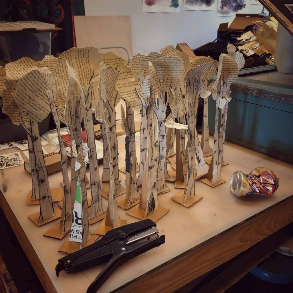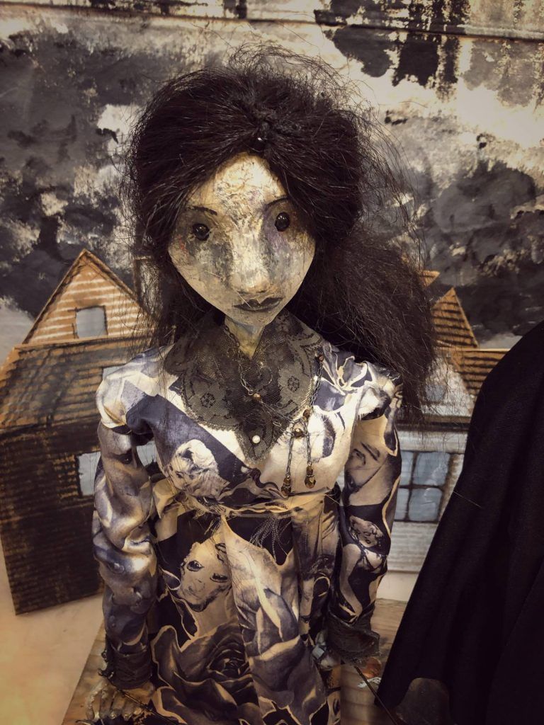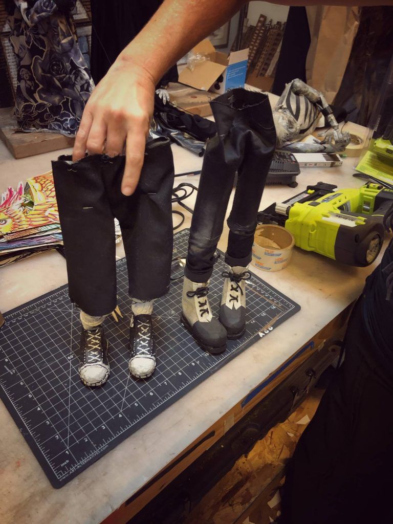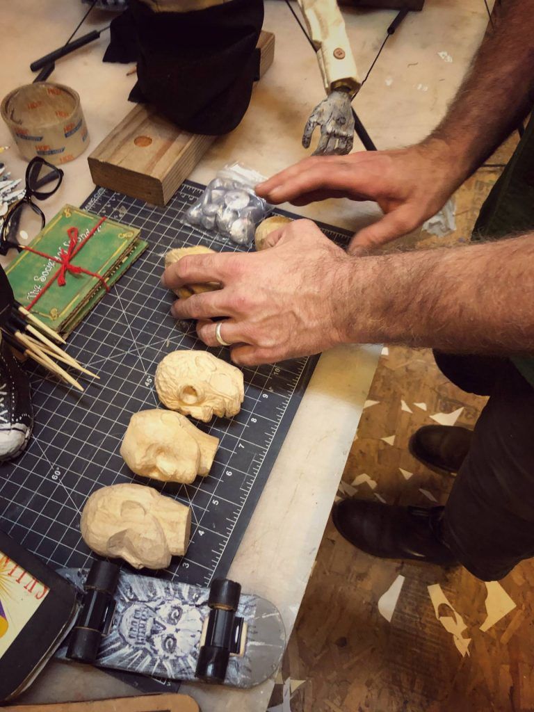 “It’s the ultimate mixed media: craft, performance, plot,” says Gunn, as he shaves off a bit of wood from a solid wooden head he’s been patiently working on as we talk. Rountree and Gunn create everything they use in their puppetry by hand, mostly from cardboard, castoffs, and trash, consciously or subconsciously relishing the life history of the rubbish. Tellingly, their first date was making cardboard sculptures until two in the morning, “and then we pretty much were inseparable,” laughs Rountree. Both studied literature and art, the right mix of disciplines to weave intellectual subplots, adult themes, and political commentary while avoiding heavy-handed moralizing. With a deep respect for the interpretation of the viewer, their thought-provoking work retains the power to inspire childhood wonder. I ask where their stories come from: “Are they made up out of thin air, based on mythology, movies, literature?” Without looking up from his whittling, Gunn answers: “All.” Rountree adds that they are constantly reading, researching, and learning, to fuel their creativity. At the time, she was reading Tim Morton, a philosopher with a science bent who debunks the scientific method, instead looking to artists to frame questions and find reality through metaphor. Heady stuff — and they say puppetry is for kids!