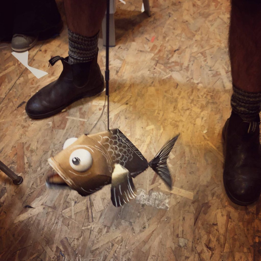 On a table sits a handmade stage with painted cardboard screens; each painted scene is the next stage backdrop in a series of stories. Gunn explains that the first story is about a man without a face, “and we are the capricious gods controlling him,” putting his hands together with a devilish grin. With each parting of the cardboard they share another story; the last backdrop a story about a fish who turns into a man and won’t eat fish anymore.