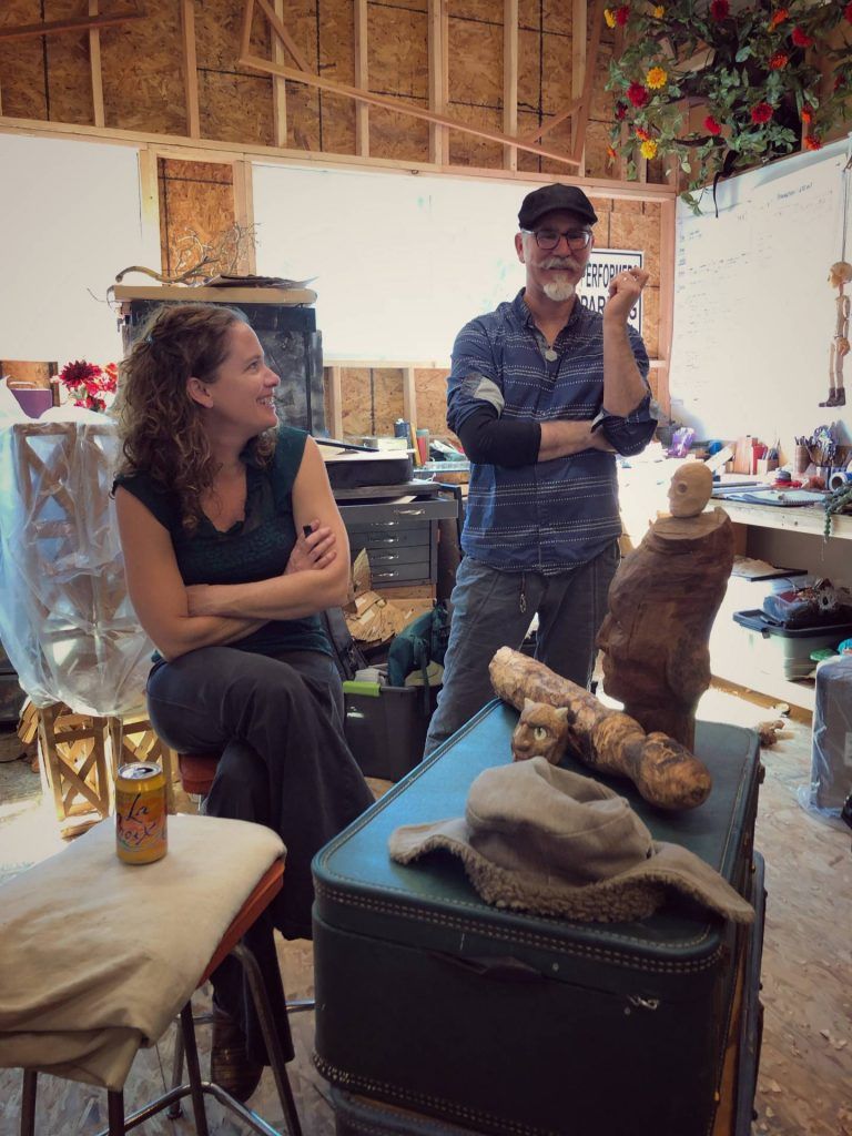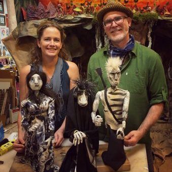 I first visited Gunn, and his partner Bridget Rountree, before COVID-19 hit. They had just moved into the studio-barn built with their own hands. They couch surfed for four months during the construction, right after a five-month European tour with their usual sundry collection of performances in rural fairs, workshops in Prague, festivals in Germany, collaborations in London, and/or performances in the Middle East. Many Americans would be surprised by this travel calendar, not realizing how popular puppetry is in other parts of the world. Although sometimes referred to as the “bastard child of theater”, puppetry has a long and respected history in Europe. It’s a discipline equal parts craft, art, theater, storytelling, and, of course, a special kind of “magiciantry” to bring the puppets to life. A skilled puppeteer is an artist who can construct a person, place, and thing, and bring them to life, drawing upon sources as diverse as fables and current events. Animal Cracker Conspiracy lives up to this demanding standard whether they’re performing on stilts, behind shadow screens, or animating sock puppets.