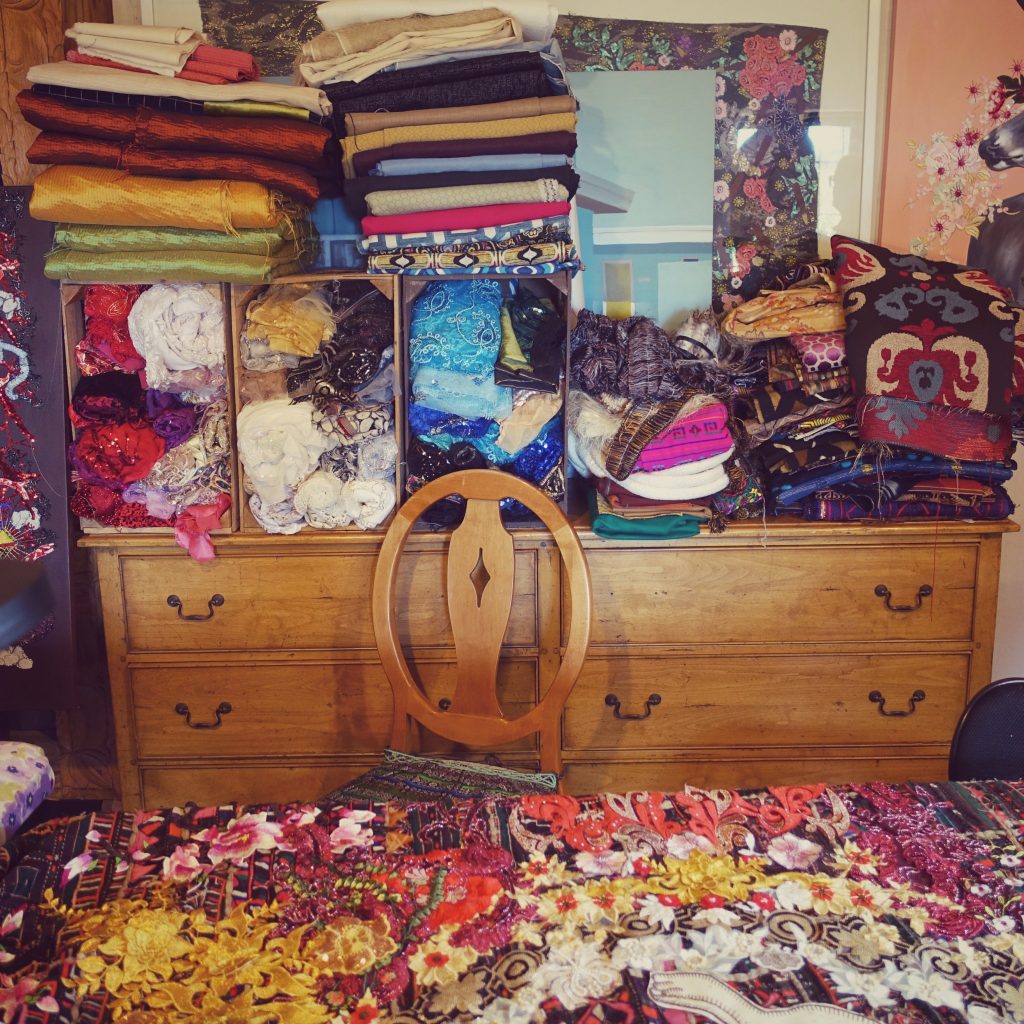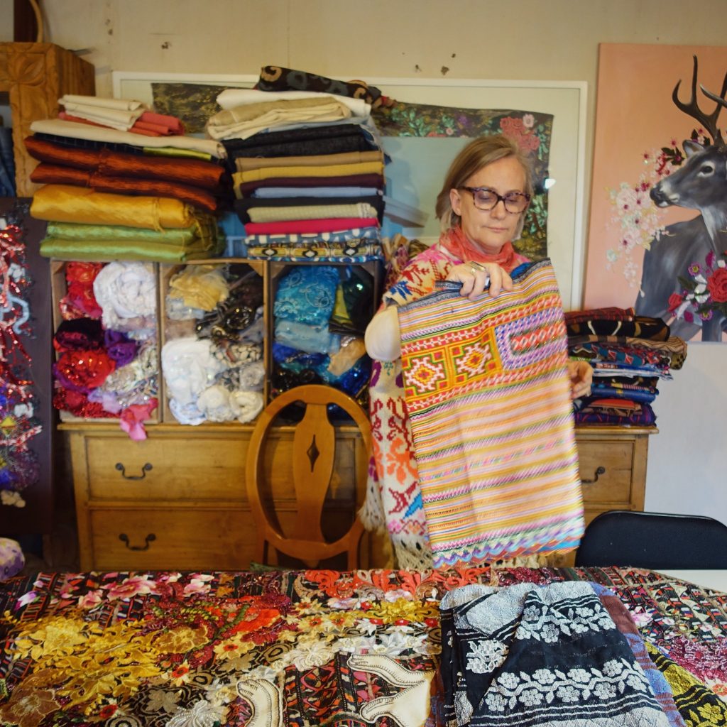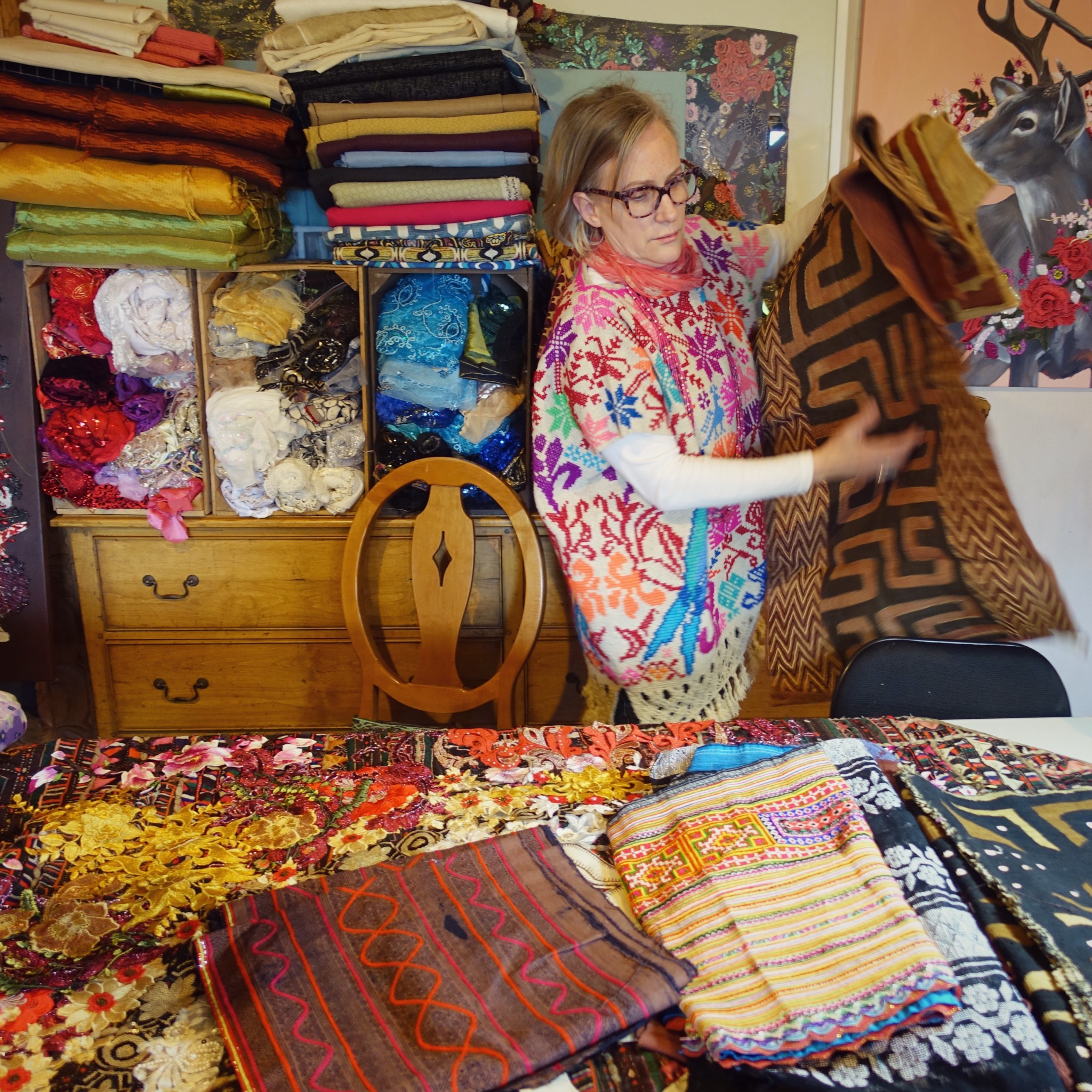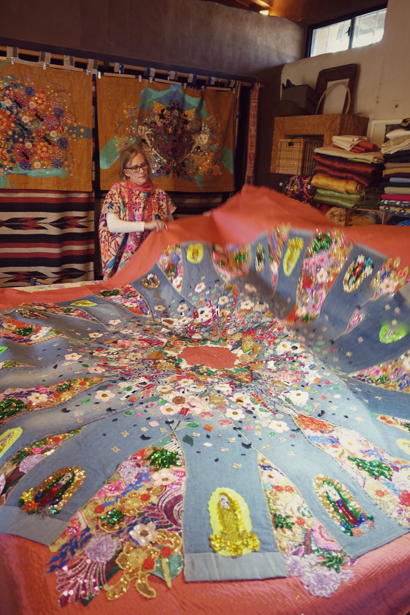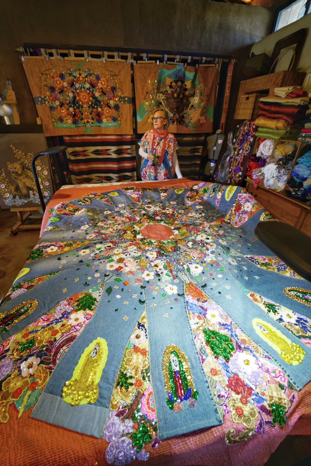 Deeply recessed windows in the thick adobe walls of her studio let in the soft spring light of the desert. Neatly folded against the back wall are stacks of fabric. Sparkles, iridescent sheens, natural fibers and embroidery tease the eye with each fold. She pulls down one piece after another. “This one is from Thailand, this one Italy, Czech, Africa….” She lays down the gorgeous textiles from around the world—in yellow and raspberry swatches, deep blue and orange designs, and a woven black and red double helix. From one sparkling pile she pulls a fabric with flowers sewn in sequins, explaining that she likes to mix fine fabrics with plastics, and vintage with contemporary. “It’s a sort of un-fashion.” She smiles mischievously, showing her gentleness flecked with humor.