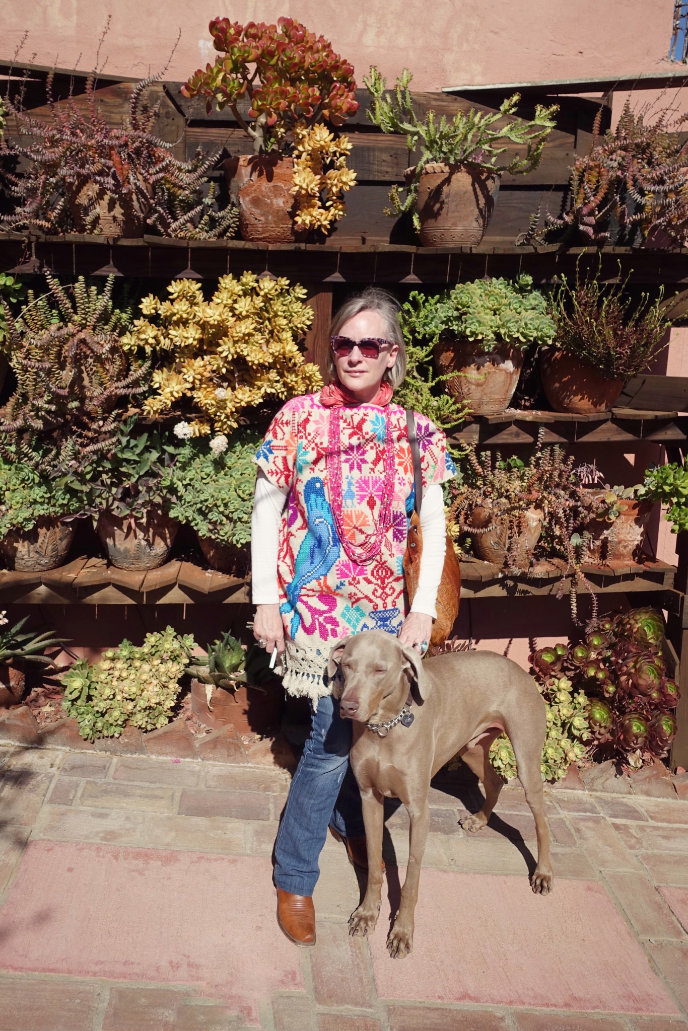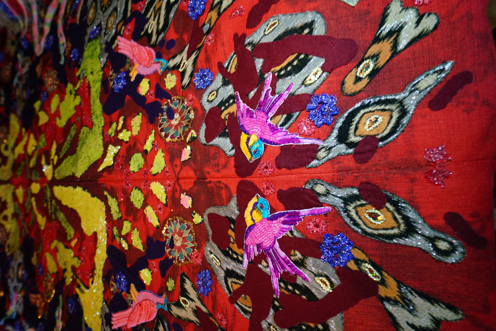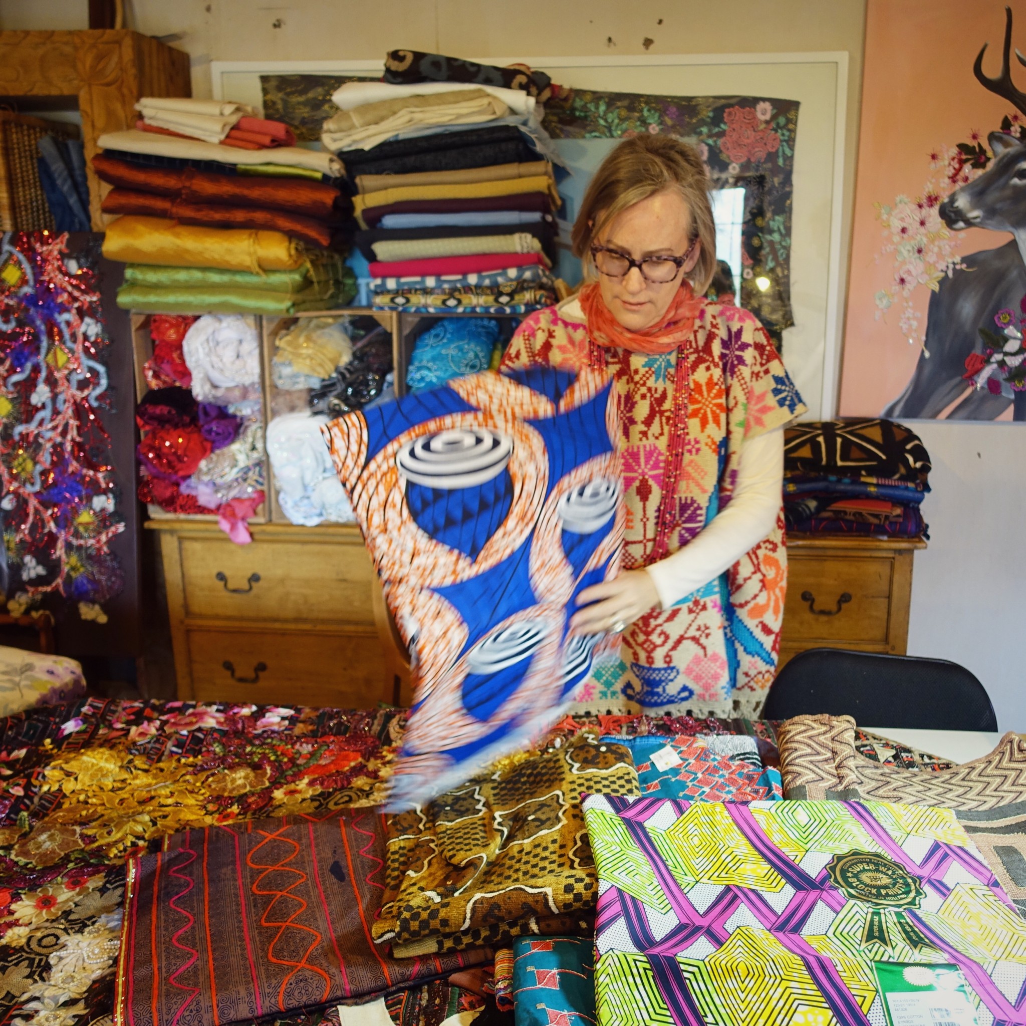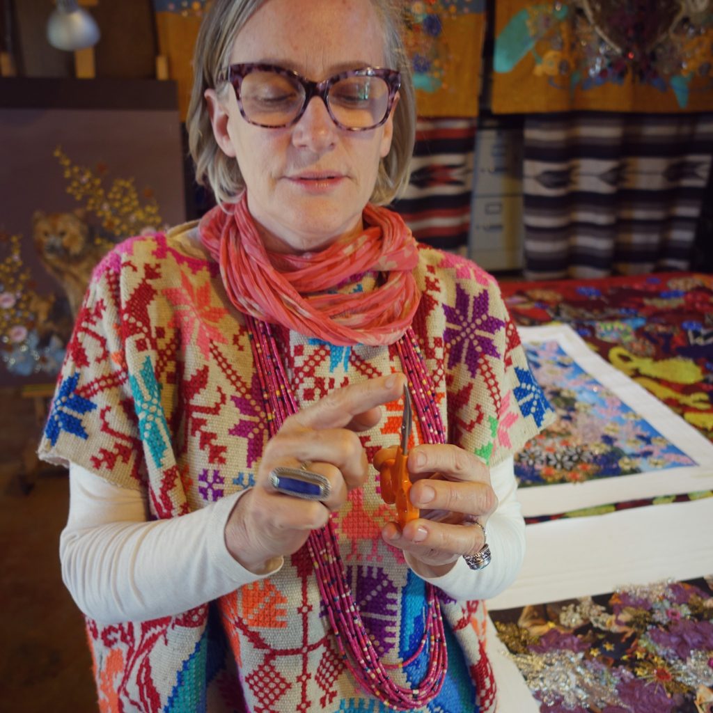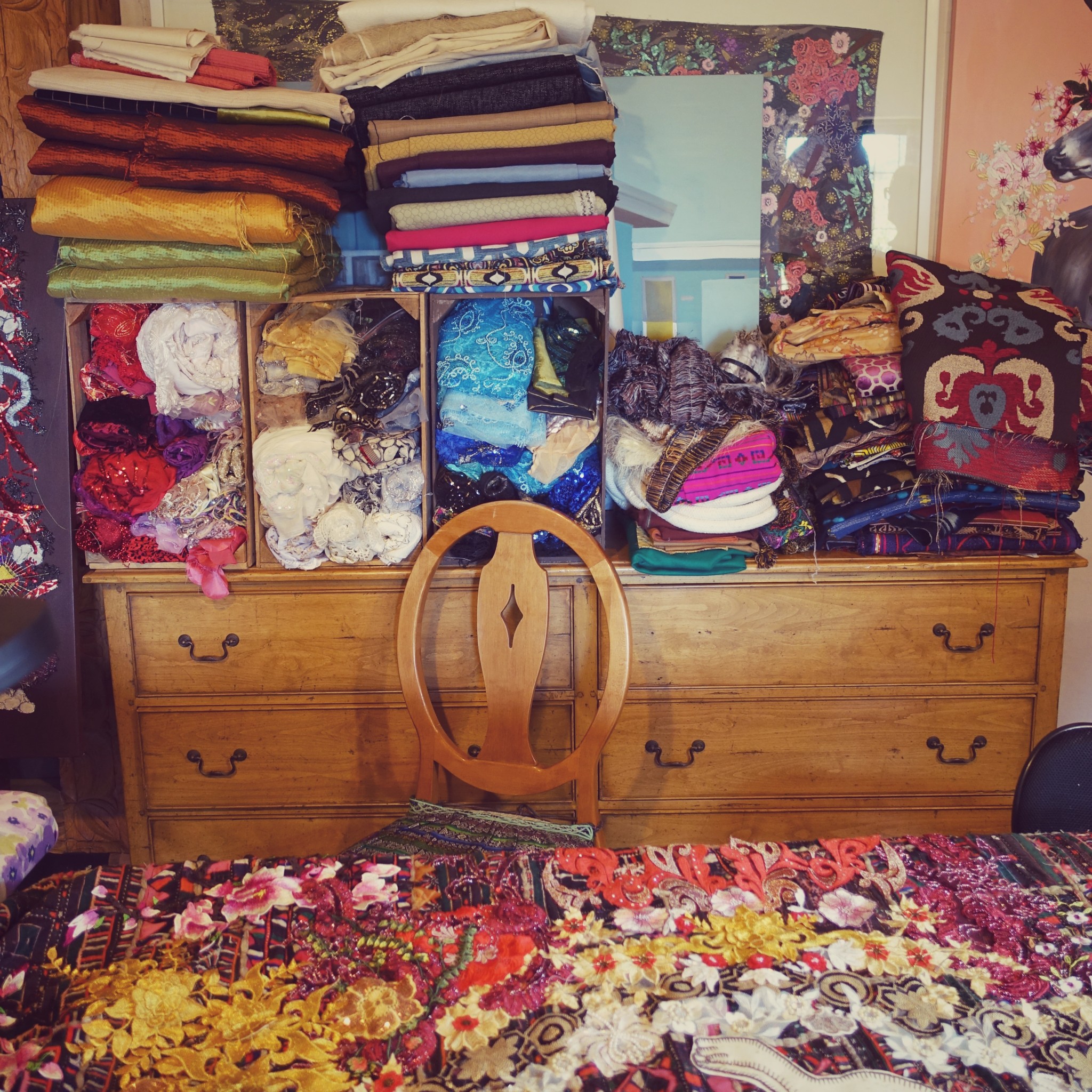Deeply recessed windows in the thick adobe walls of her studio let in the soft spring light of the desert. Neatly folded against the back wall are stacks of fabric. Sparkles, iridescent sheens, natural fibers and embroidery tease the eye with each fold. She pulls down one piece after another. “This one is from Thailand, this one Italy, Czech, Africa….” She lays down the gorgeous textiles from around the world—in yellow and raspberry swatches, deep blue and orange designs, and a woven black and red double helix. From one sparkling pile she pulls a fabric with flowers sewn in sequins, explaining that she likes to mix fine fabrics with plastics, and vintage with contemporary. “It’s a sort of un-fashion.” She smiles mischievously, showing her gentleness flecked with humor.
