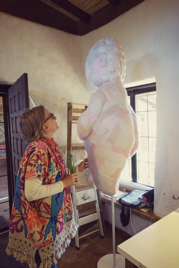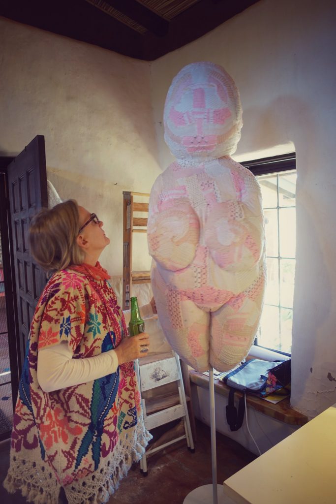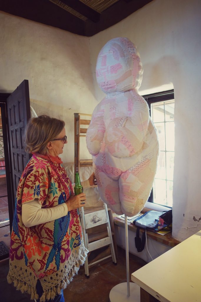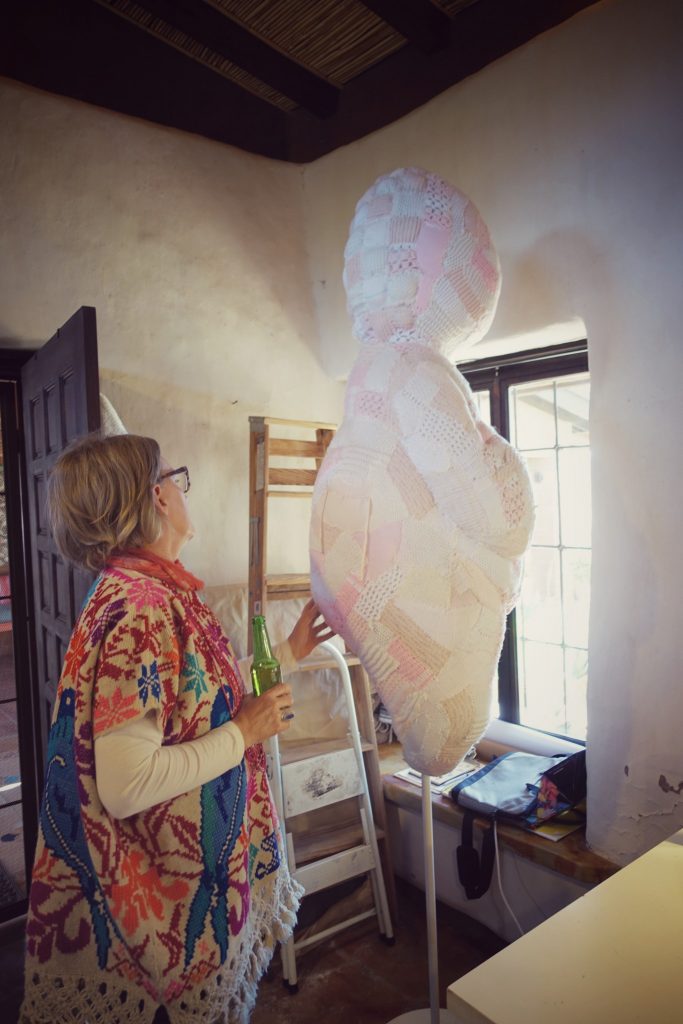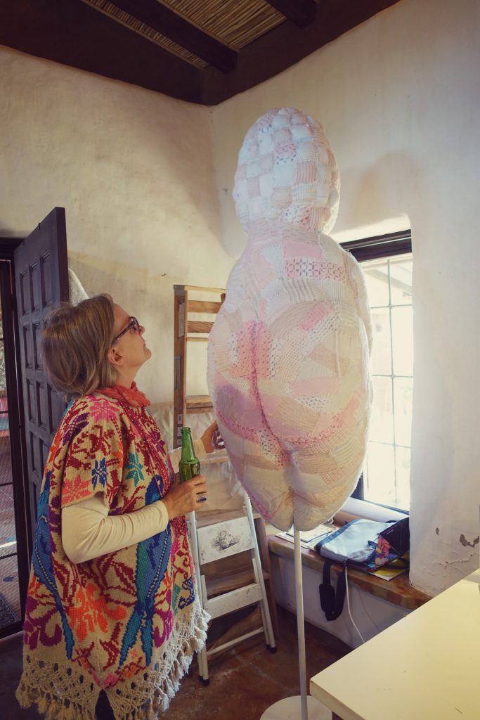 Walking into the adobe studio of textile artist Irma Sofia Poeter, we are greeted by a huge Virgin of Willendorf set on a pole well above head height. Stitched together from swatches of knitted pink and white yarn, it is one of the last remaining pieces from Poeter’s solo show at CECUT, Tijuana, Mexico (“Cosidos”, 2001). “It’s made from second-hand baby blankets,” she says in her satiny, soft-spoken Mexican accent. She smiles as she looks up at it lovingly, touching its belly gently, and slowly turns the enormous fertility figure so we can see its true-to-form voluptuous bum and billowing breasts. The sacred nature of the piece mixed with the traditional women’s work of sewing and knitting is no coincidence. Celebrating femininity and spirituality is an important part of Poeter’s life and creativity. She even constructed a sweat lodge on her property in which she regularly holds sacred ceremonies with locals.