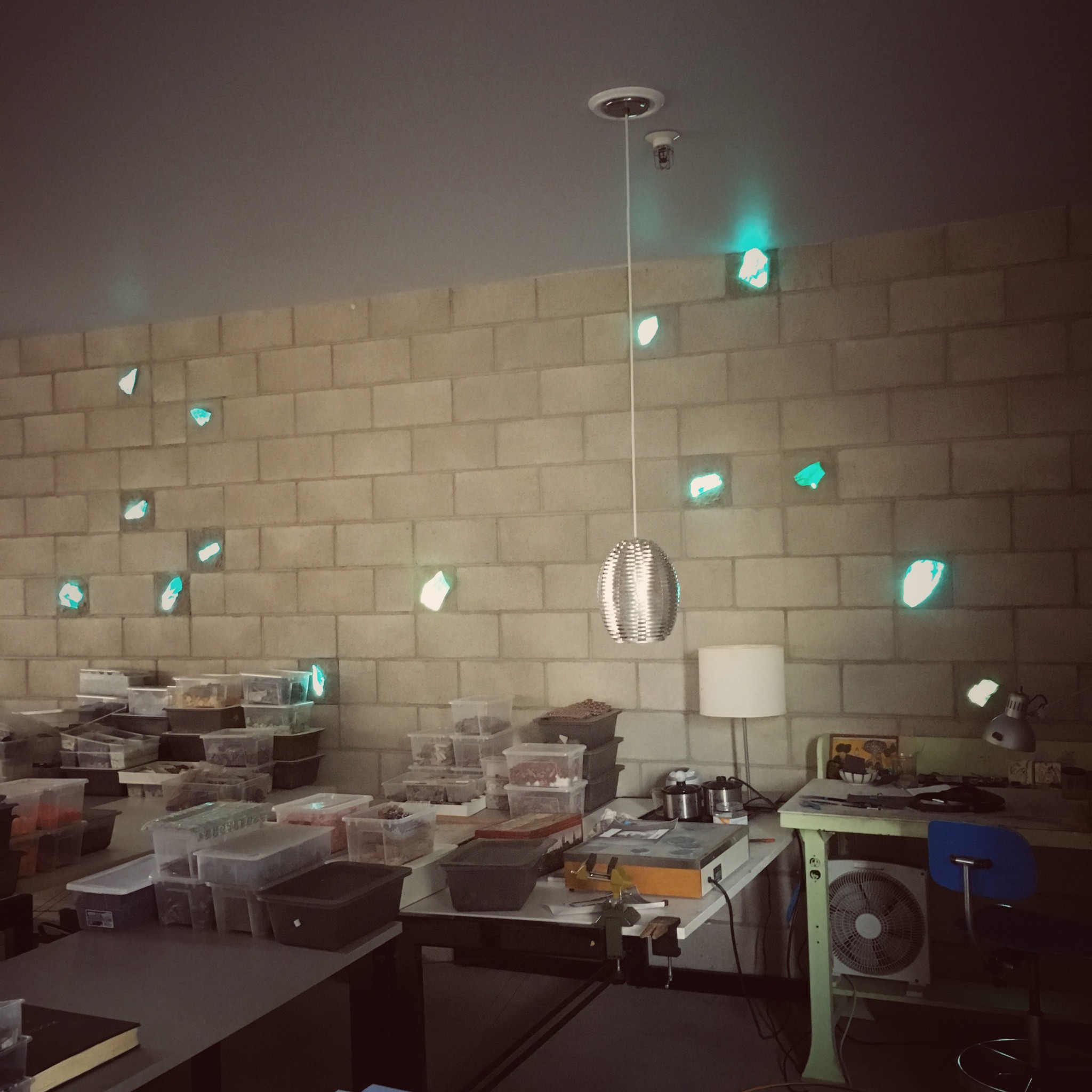 Sunlight passing through the glass chunks in the cinderblock wall.