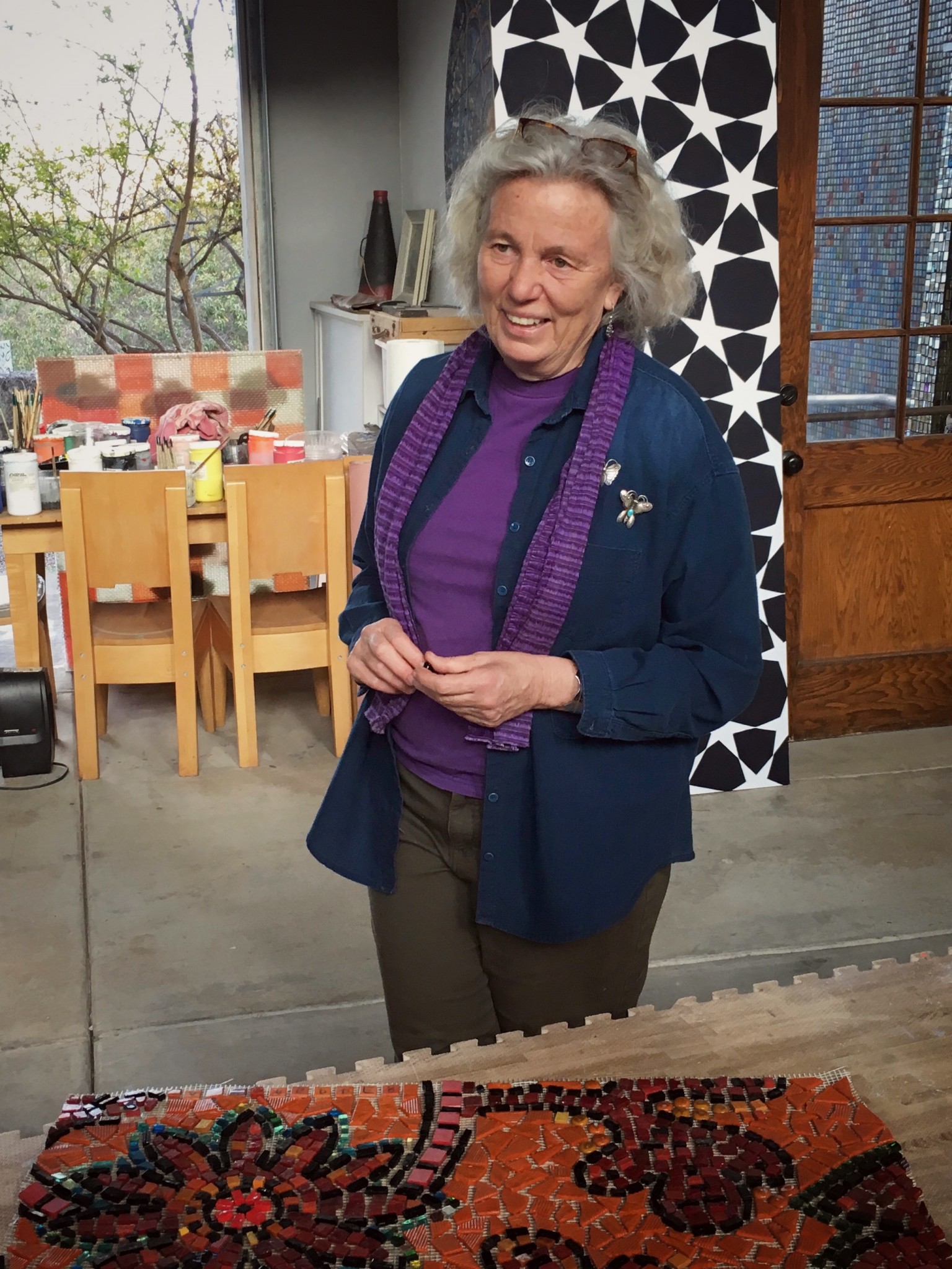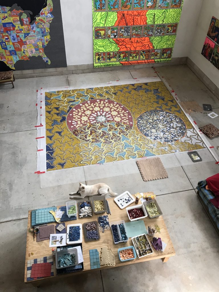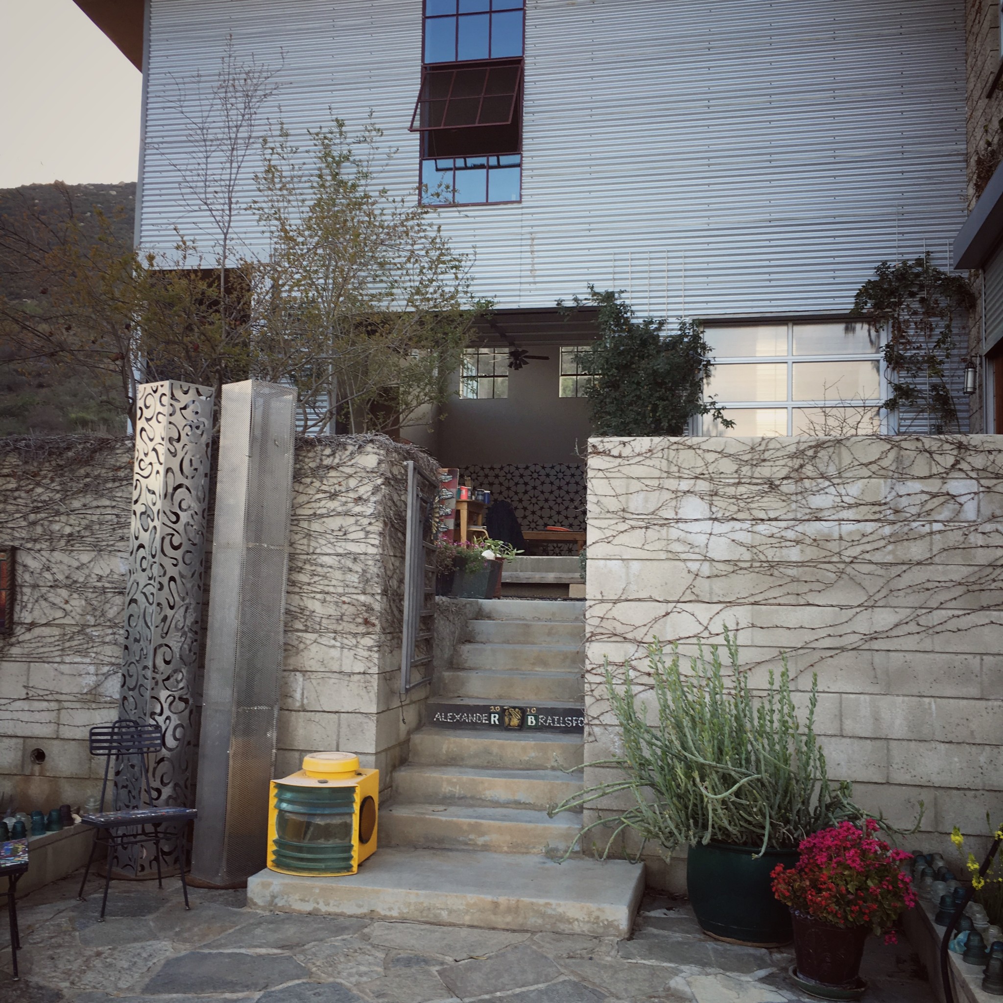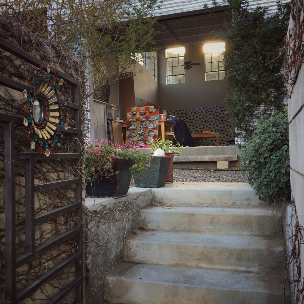 Walking back to the house I notice how the driveway sparkles here and there with shiny pieces of colored glass and tesserae of every material accidentally dropped over the years. Little traces of humanity that, like the bottle tops, have survived the wildfires, although very different circumstances have precluded their abandonment. I ask Brailsford how children react when they visit, and she assures me that digging the little treasures from the dirt keeps them very busy. A huge open space surprises me as we enter the studio. Clerestory windows bathe the open space with light. Huge geometric paintings, the work of Brailsford’s partner Wick Alexander, rest against the wall. The open garage door lets in light and air from the outside. Brailsford explains that her inspiration for the construction came from her studio at Brown Field, the WWI airport in Otay Mesa. “My studio was in the old naval officers’ mess—it had tile floors, high clerestory windows, and was part of a superb artist and fabricator community. So, when everyone was evicted by the City (sound familiar?!) I was on the lookout for land where I could recreate the Brown Field experience.”