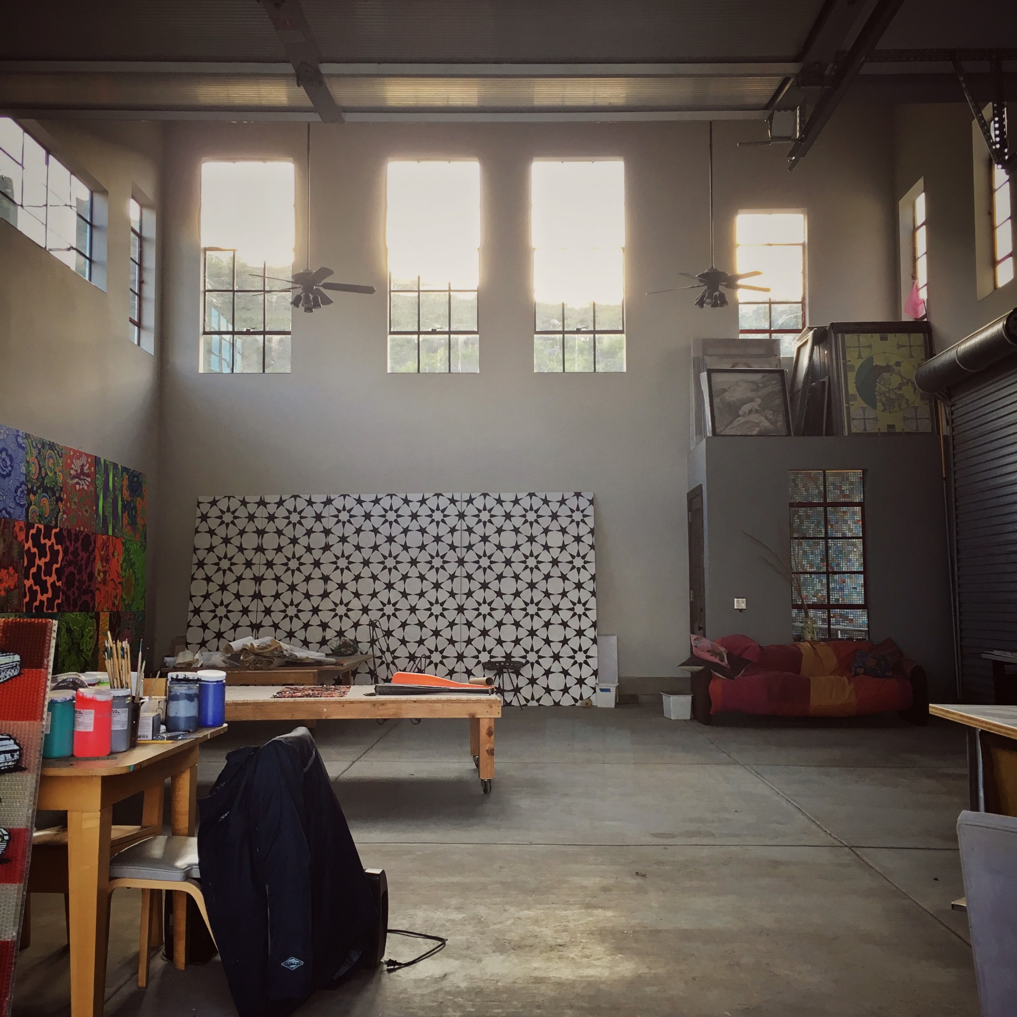 The clerestory windows in the studio with the paintings of Wick Alexander below.