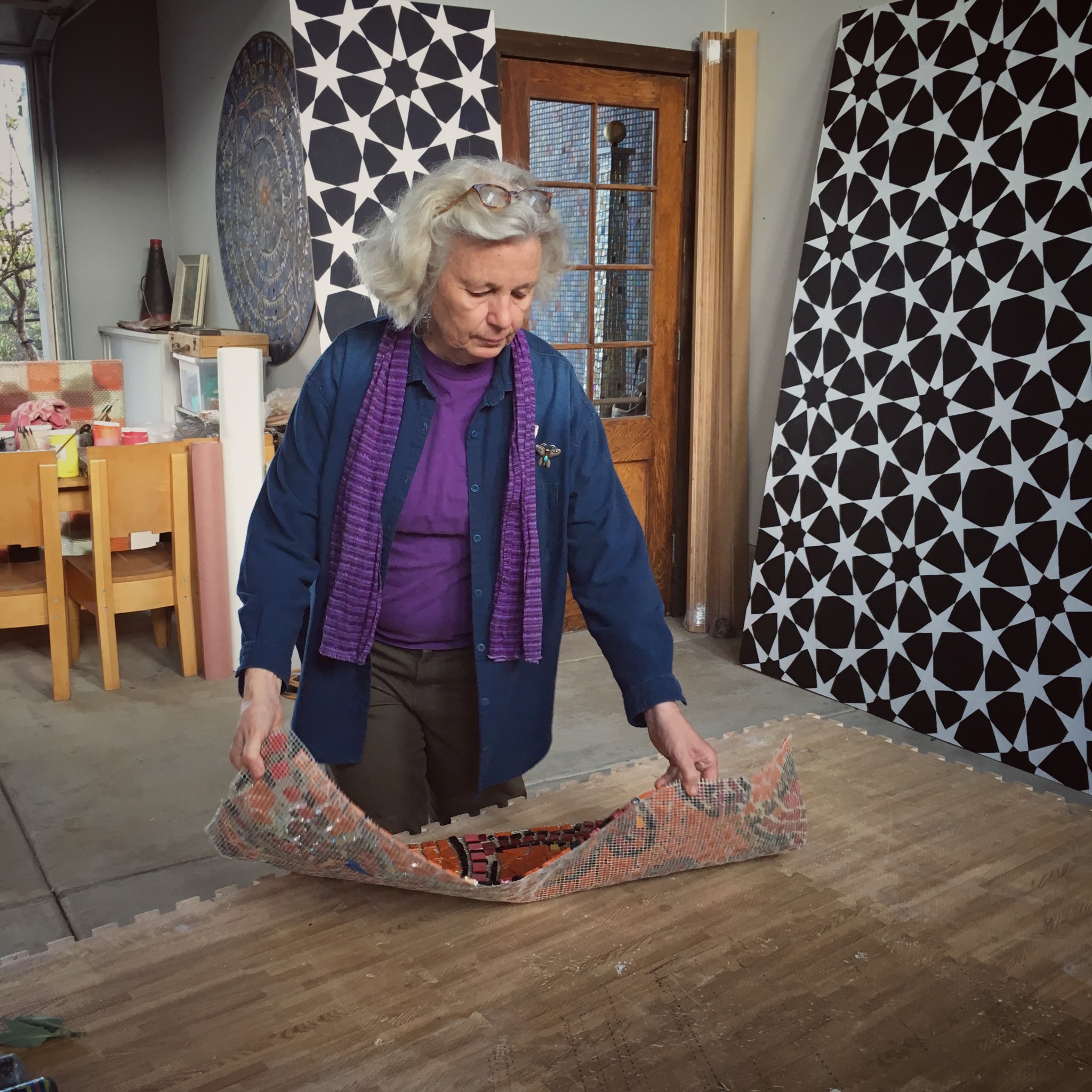Brailsford picks up a sheet of new mosaic off a table and folds it gently. The mosaic is created on a flexible plastic mesh, a patented co-invention of hers that allows an artist to fabricate a mosaic in the studio and then transport the completed piece to an installation site. After a few backbreaking projects creating a mosaic onsite, out in the elements, she decided there had to be a better way. The artist uses a water-soluble glue to adhere the mosaic to a plastic mesh. She then places the mosaic face-down, trowels on wet cement, and lifts the mesh away. Not only does this technique allow the artist to work in the comfort of her own studio, but it affords the artist the ability to create mammoth-scale public-art projects. Brailsford’s work can be found in over half the US states, from mass-transit systems to national wildlife refuges—even a water treatment plant—and is expanding into Europe.
